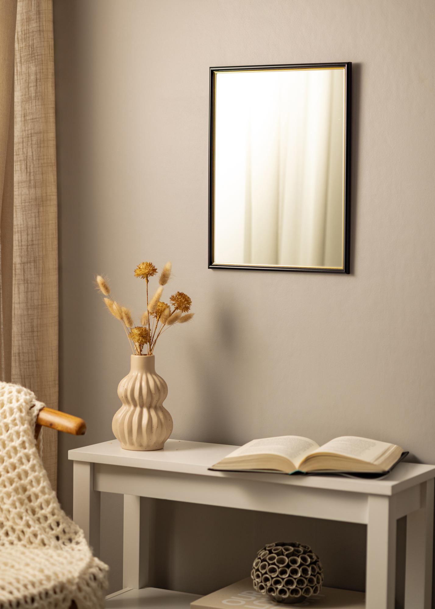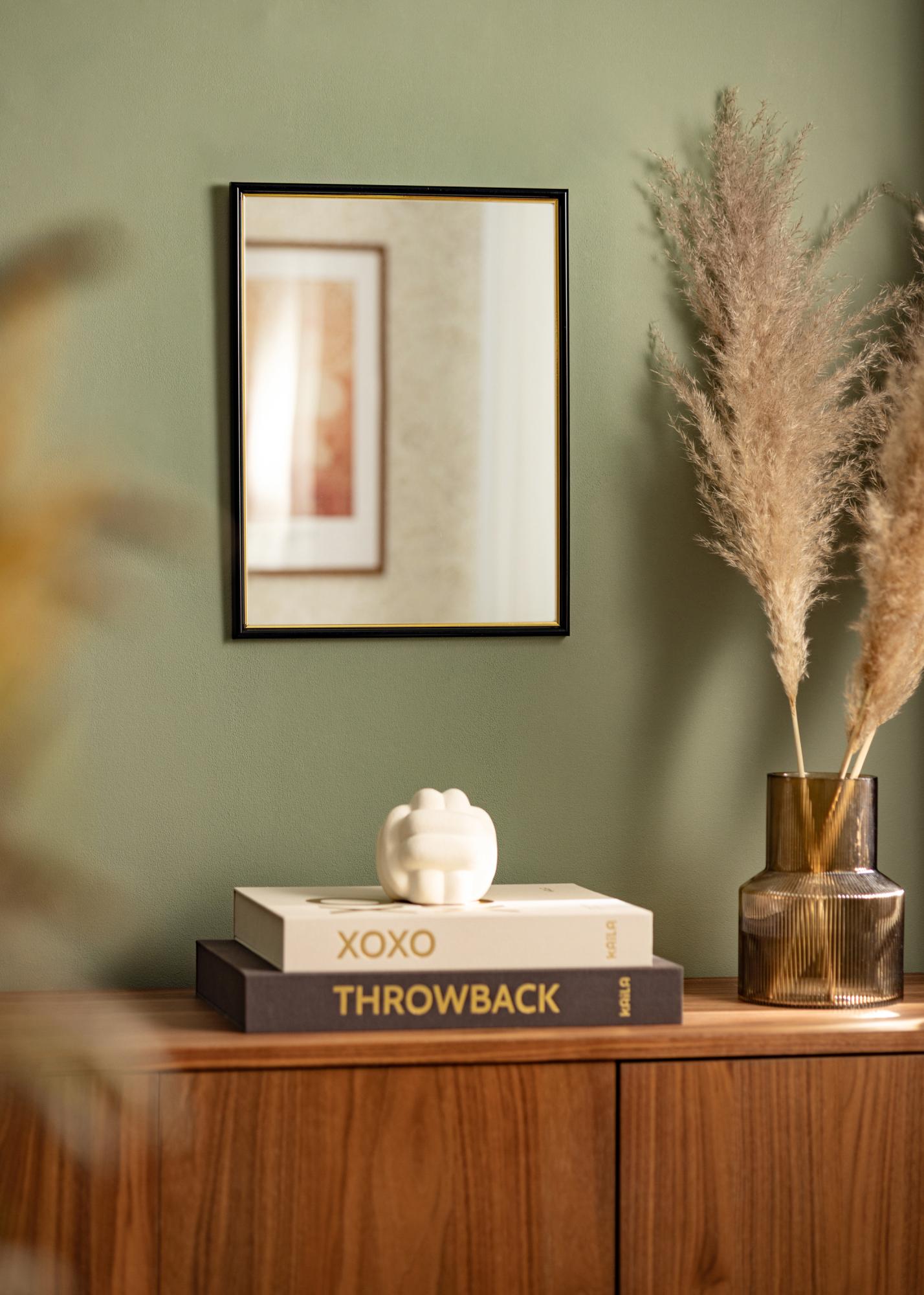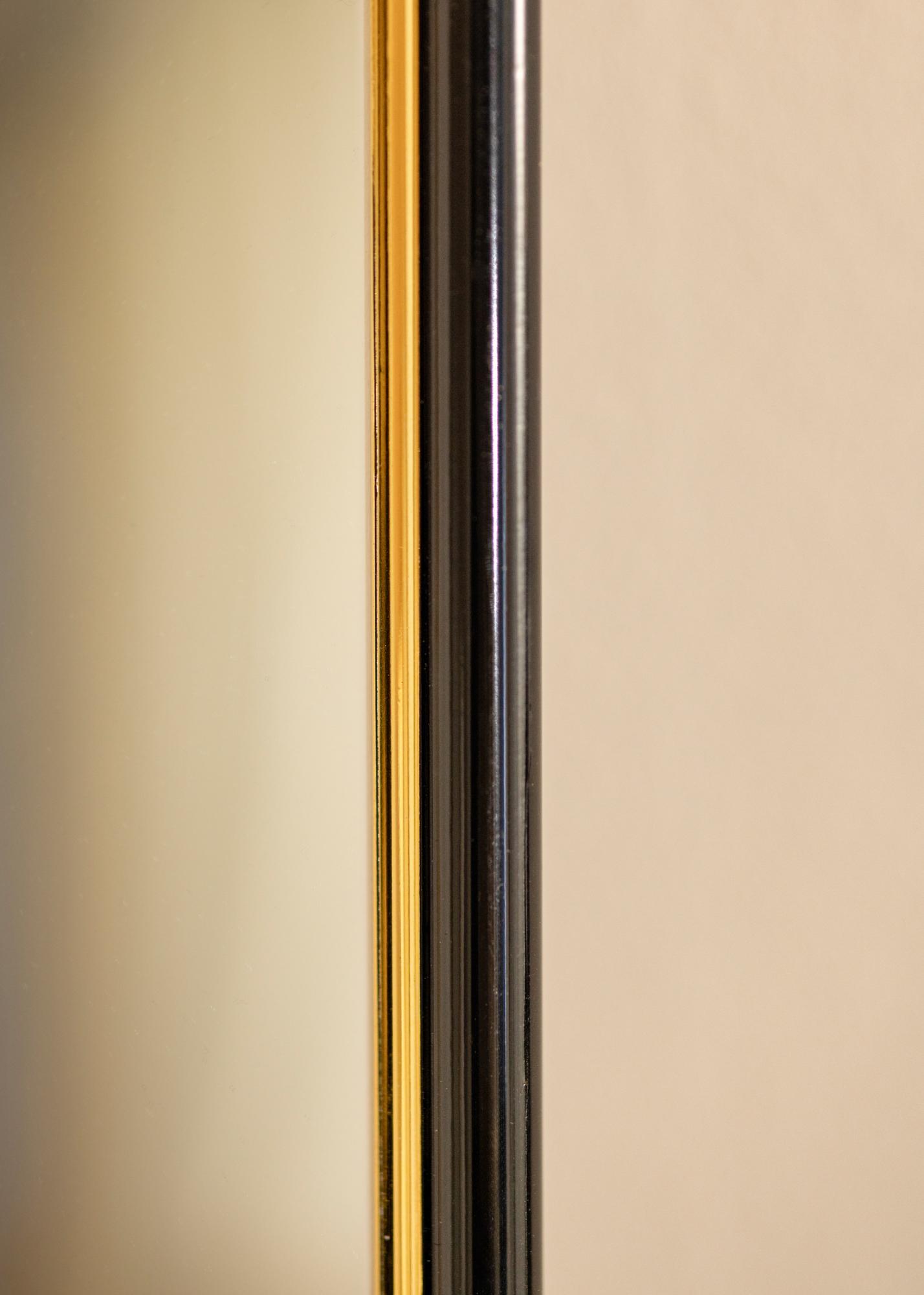Pakeiskite atmosferą koridoriuje, vonios kambaryje ar svetainėje pakabindami šį prabangų veidrodį! Veidrodis yra juodas su auksiniu pavidalu arčiausiai stiklo. Spalvos puikiai dera su interjero detalėmis, pavyzdžiui, juoda, auksine, violetine arba pastelinių atspalvių. Kadangi jis gaminamas pagal jūsų pageidavimus, galite būti tikri, kad puikiai tiks ten, kur norite jį turėti.