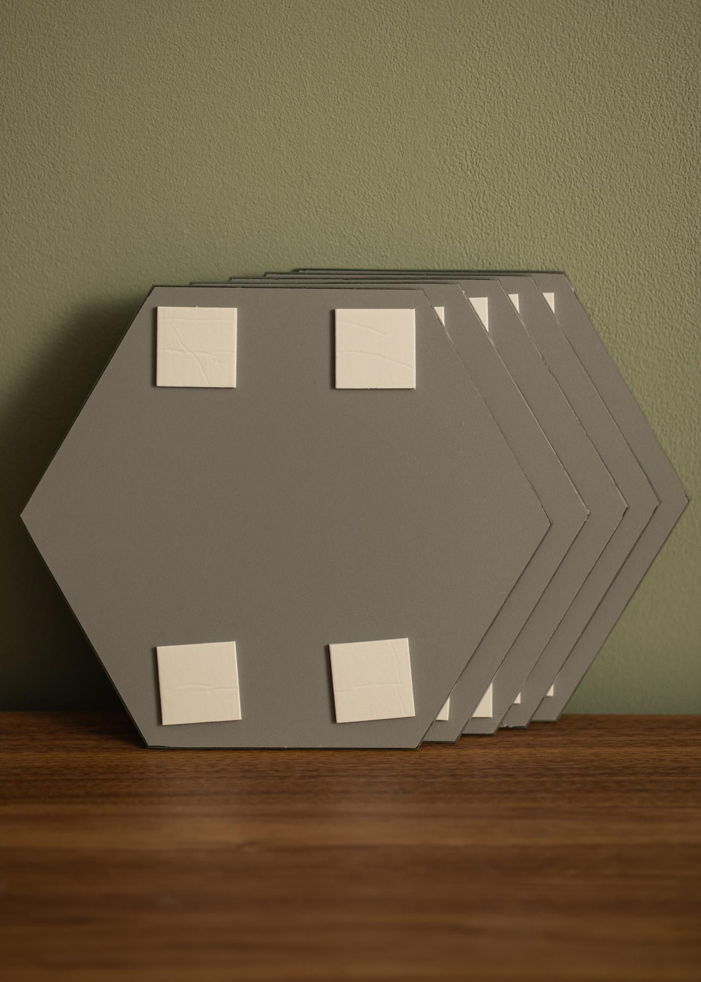 Šie itin madingi šešiakampiai veidrodžiai parduodami po 5 vnt. Jie pristatomi kartu su dvipuse lipnia juosta, kuri leidžia juos lengvai pritvirtinti prie sienos.