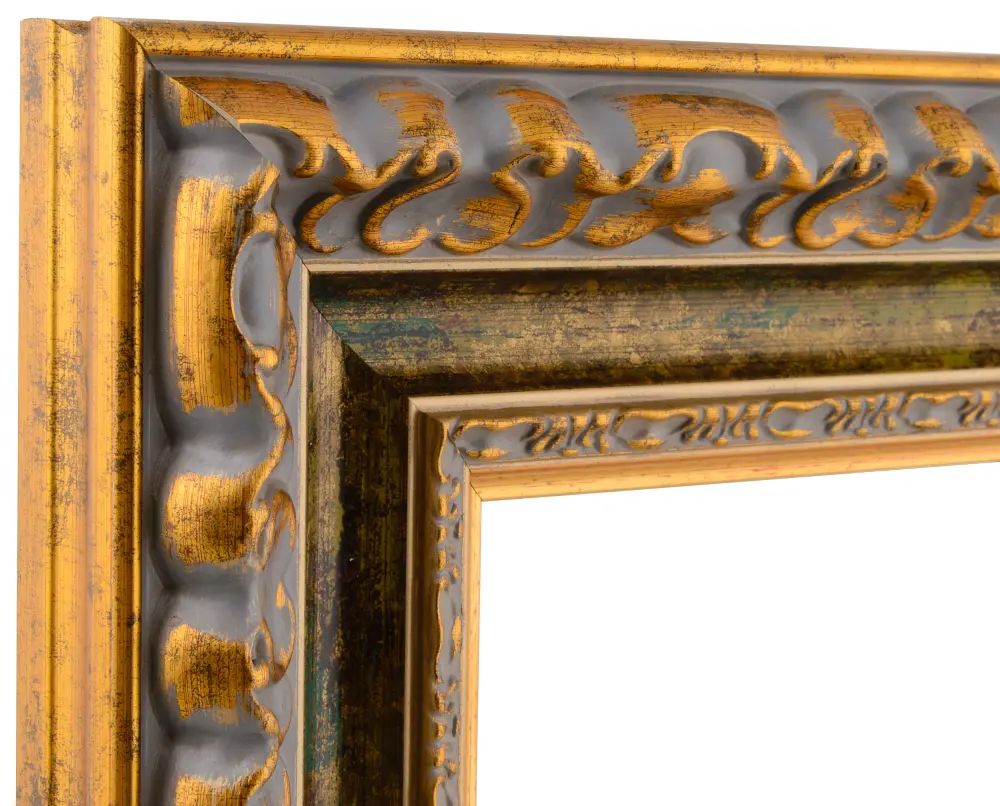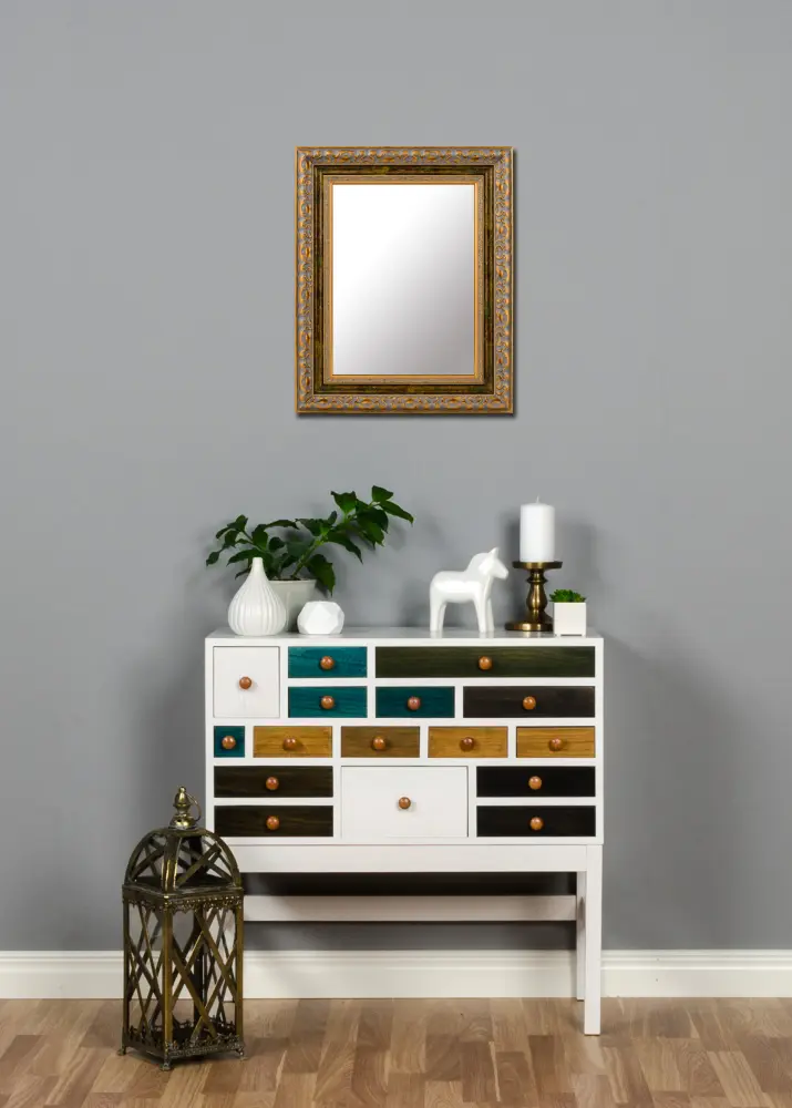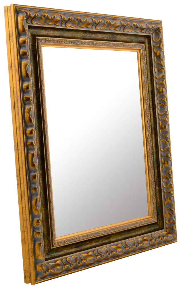 Padėdami tinkamam veidrodžiui, galite pagyvinti visą sieną! Šis prabangus aukso spalvos veidrodis turi įdomų dizainą, kuris pritraukia dėmesį. Priekyje medinė rėmė turi tiek didelį, tiek mažesnį ornamentuotą juostą, kurios susikerta susidėvėjusiame plote. Paviršius apdorotas tam, kad atrodytų būdingai sendintas. Kadangi jis gaminamas pagal jūsų matmenis, galite būti tikri, kad jis puikiai tinka ten, kur norite!