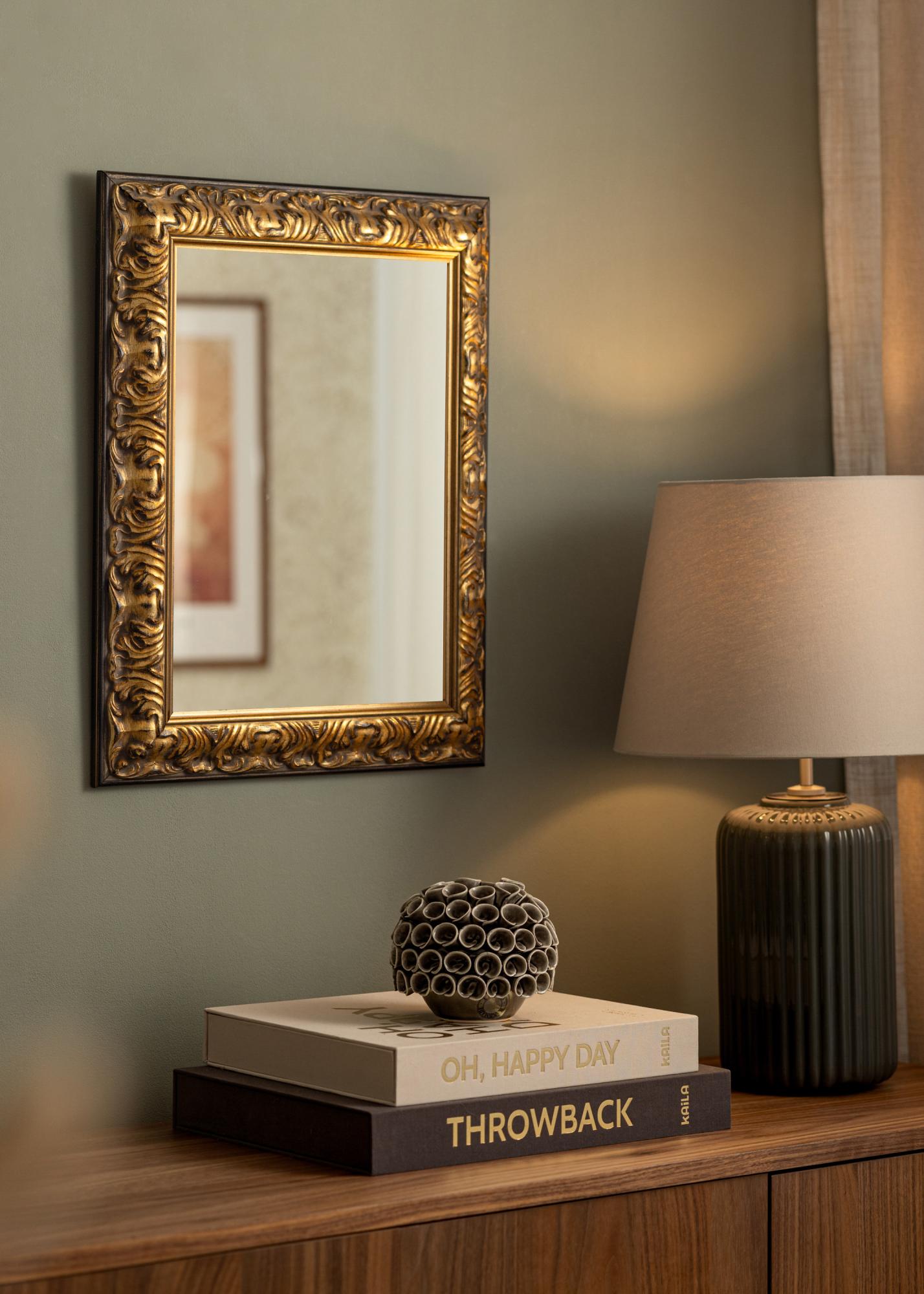 Veidrodis Odin Aukso/Juodas yra pagal užsakymą gaminamas veidrodis, kurį gaminame tam, kad atitiktų jūsų poreikius. Su elegantiška aukso apdaila ir juodomis detalėmis šis veidrodis suteikia rafinuotą ir antikos pojūtį, kuris pagerina bet kurio kambario atmosferą. Klasikinis, ornamentuotas dizainas jungia šiltą auksą su giliomis juodomis tonomis, sukuriant įspūdingą kontrastą ir laiko neturintį išraišką.