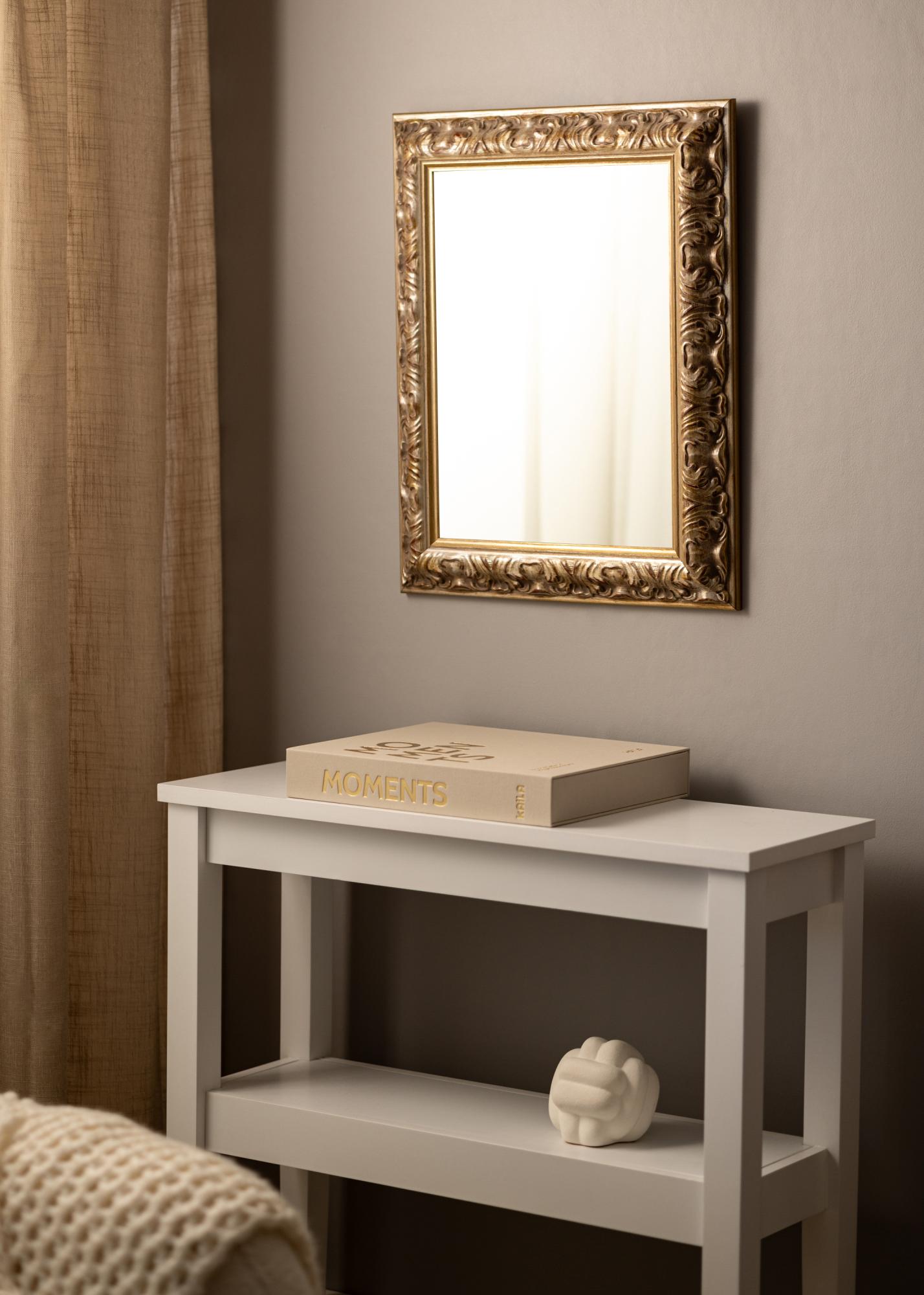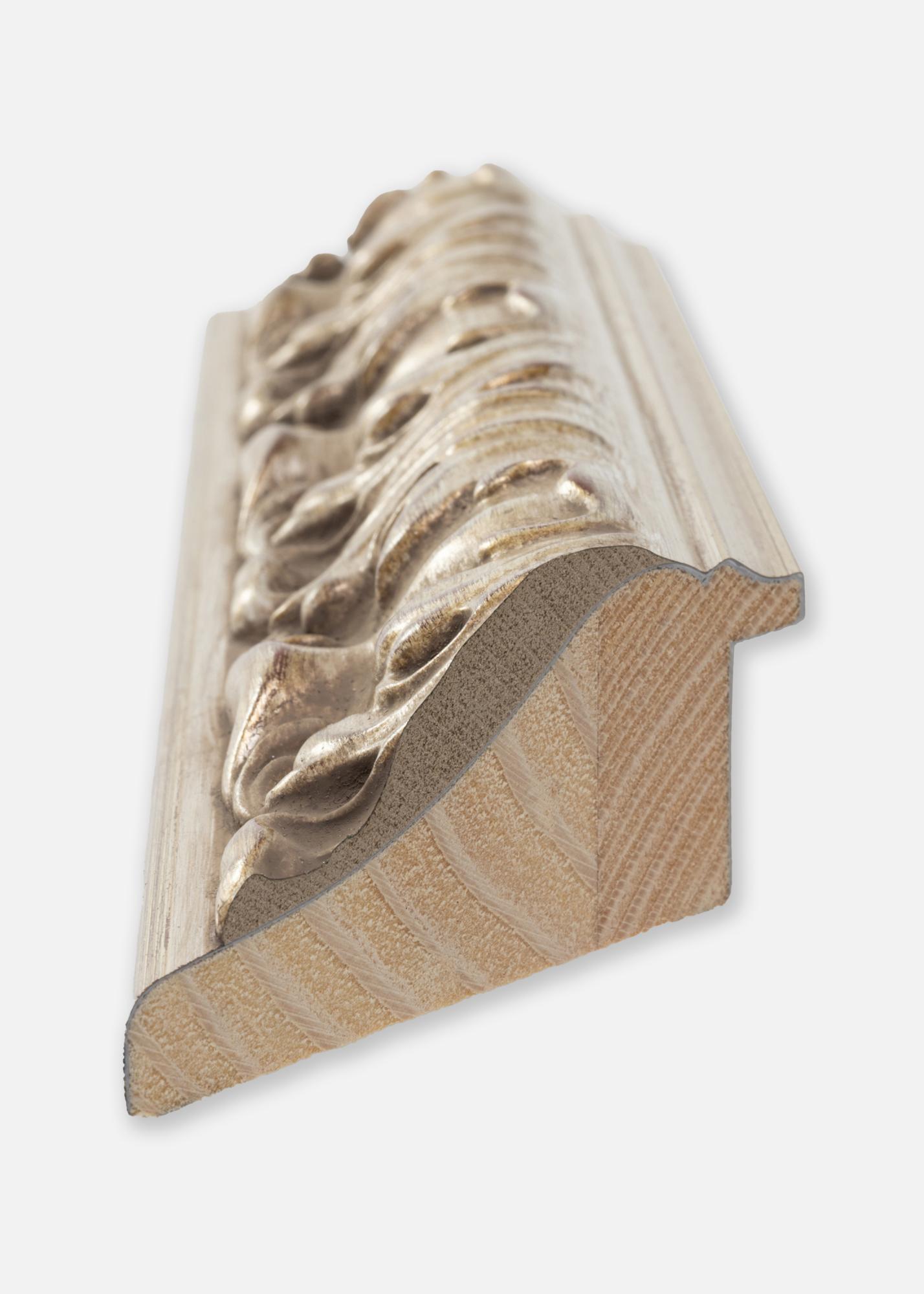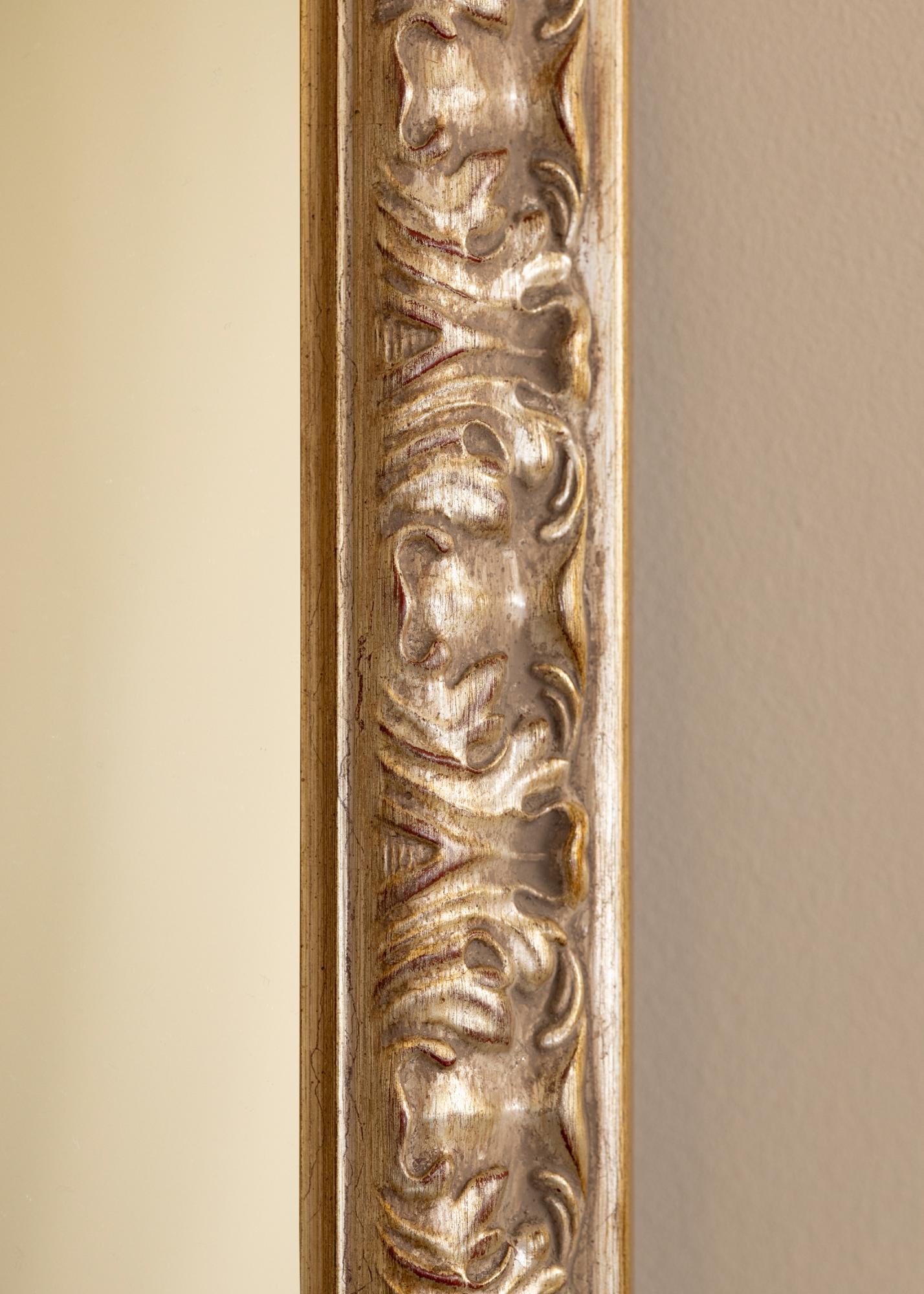 Rėmas pagamintas iš pušies ir turi antikinį sidabro paviršių su subtiliomis auksinėmis detalėmis ir raudonais akcentais. Ši spalvų derinys sukuria gražų kontrastą ir suteikia veidrodžiui klasikinį bei rafinuotą išraišką. Dekoratyvinė išvaizda leidžia veidrodžiui puikiai tikti įrėminimui, kur siekiama elegantiško jausmo.