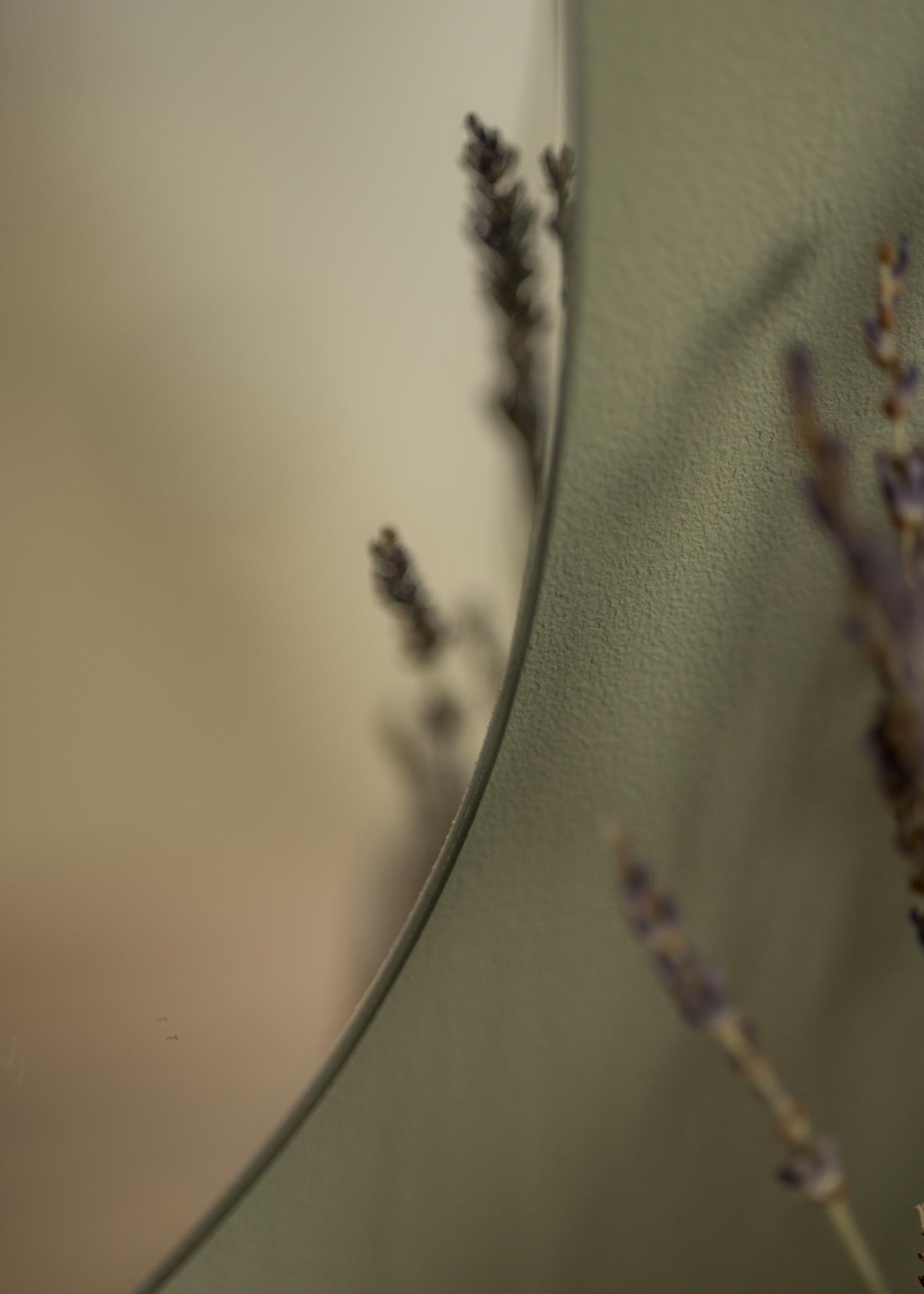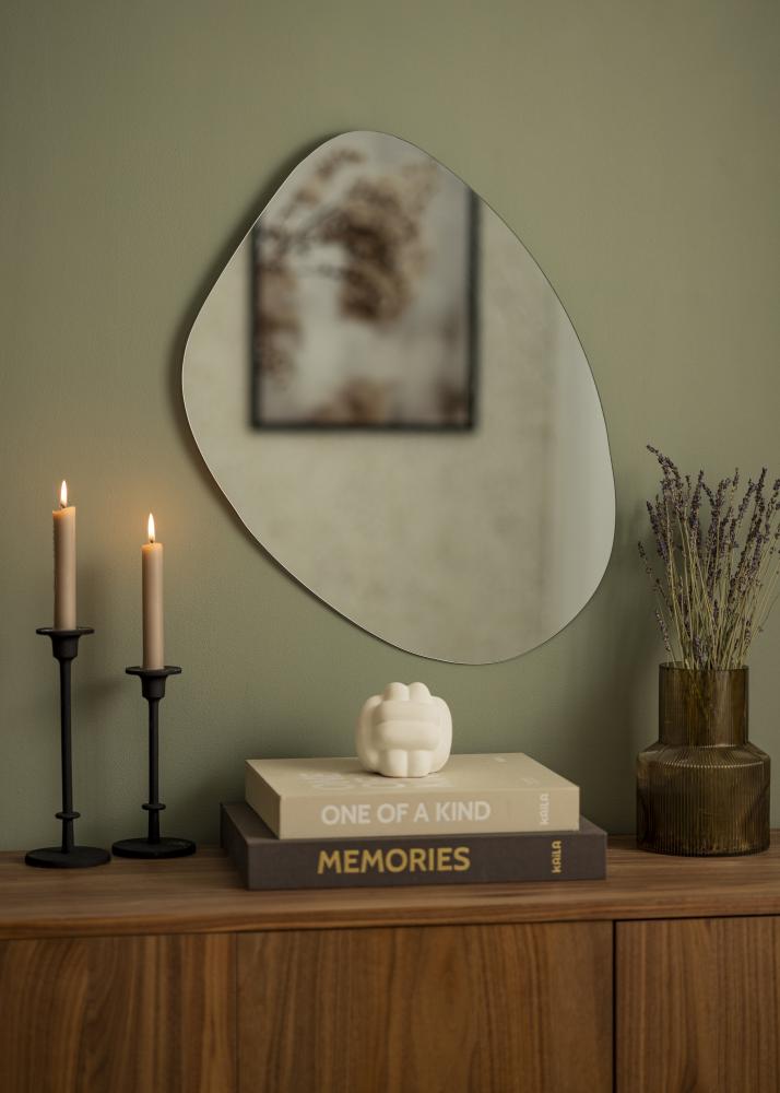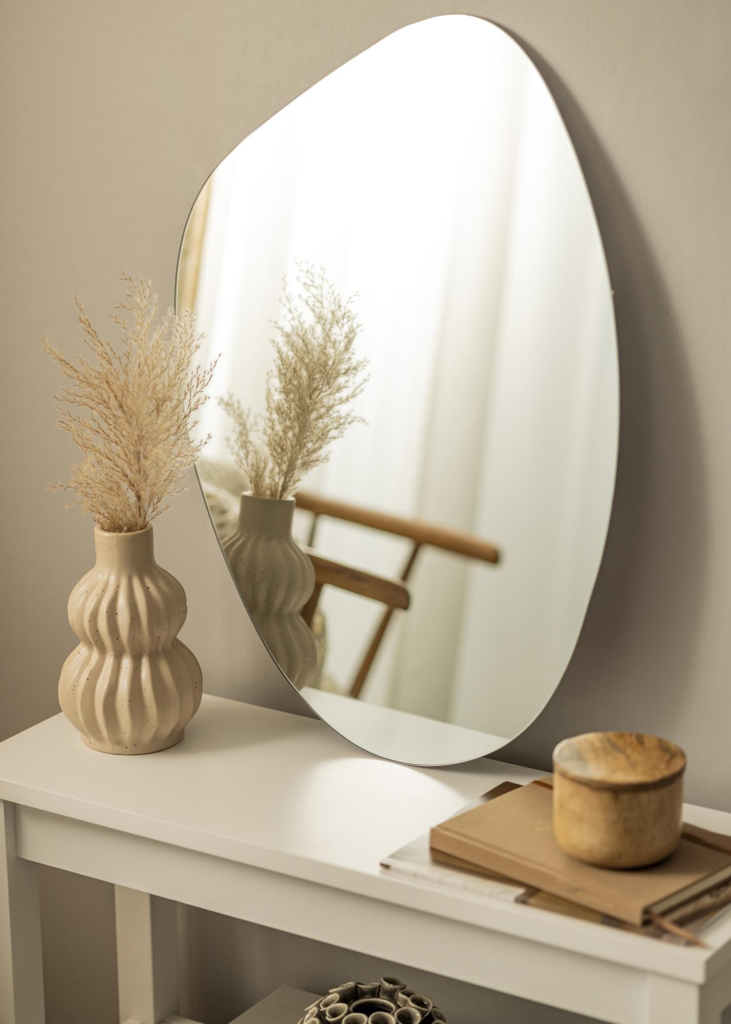 Šis veidrodis turi minimalistinę išvaizdą, su be rėmelio dizainu ir plonu veidrodžio stiklu. Jis yra 50x60 cm dydžio ir lengvai sumontuojamas ant sienos, dėka sieninio tvirtinimo veidrodžio gale.