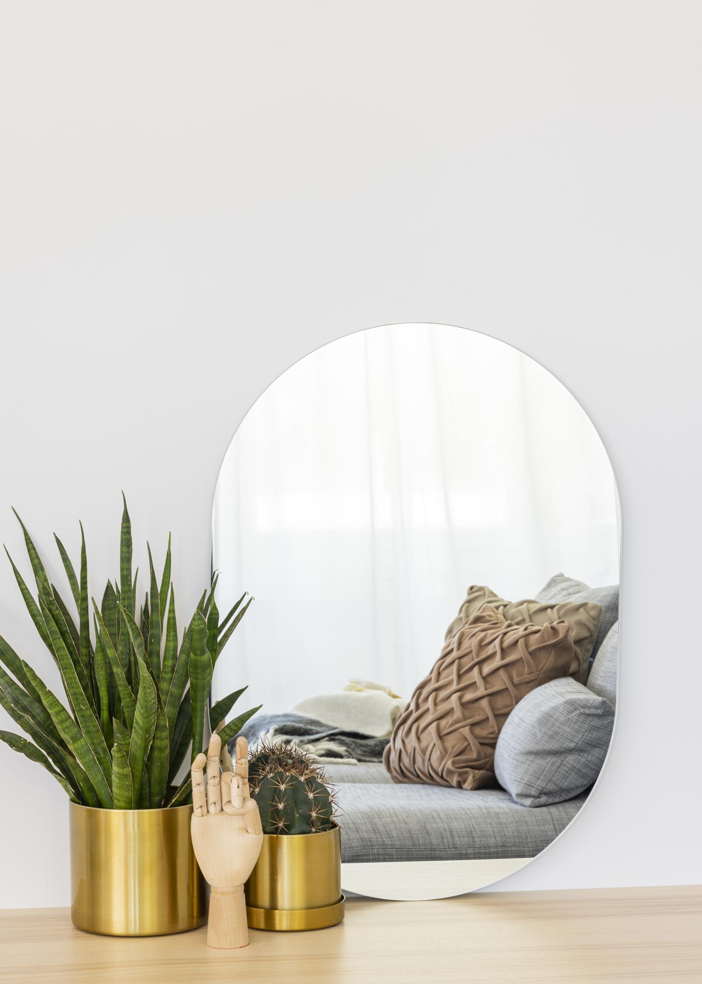 Veidrodis be krašto, ovalios formos. Puikus interjero akcentas svetainėje arba kaip mažesnis prieškambario veidrodis.