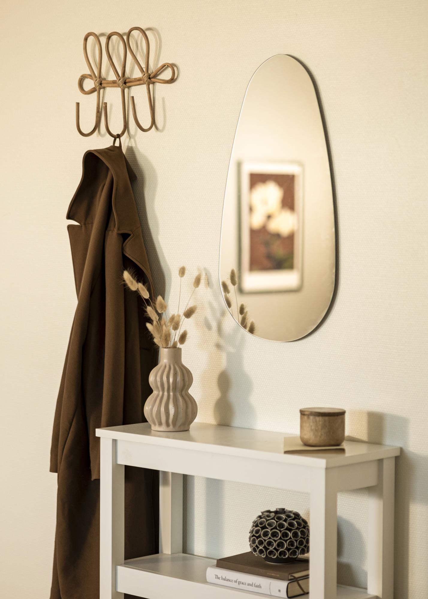 Šis veidrodis yra ne tik praktiška detalė, bet ir dekoratyvus elementas, kuris papildo jūsų interjerą. Jo elegantiška lašo forma švelniai plečiasi aukštyn, sukuriant ramybės ir grožio jausmą kambaryje. Jis yra skirtas pakabinti tiek vertikaliai, tiek horizontaliai, todėl suteikia jums galimybę pritaikyti jį pagal savo erdvę ir asmeninį stilių.