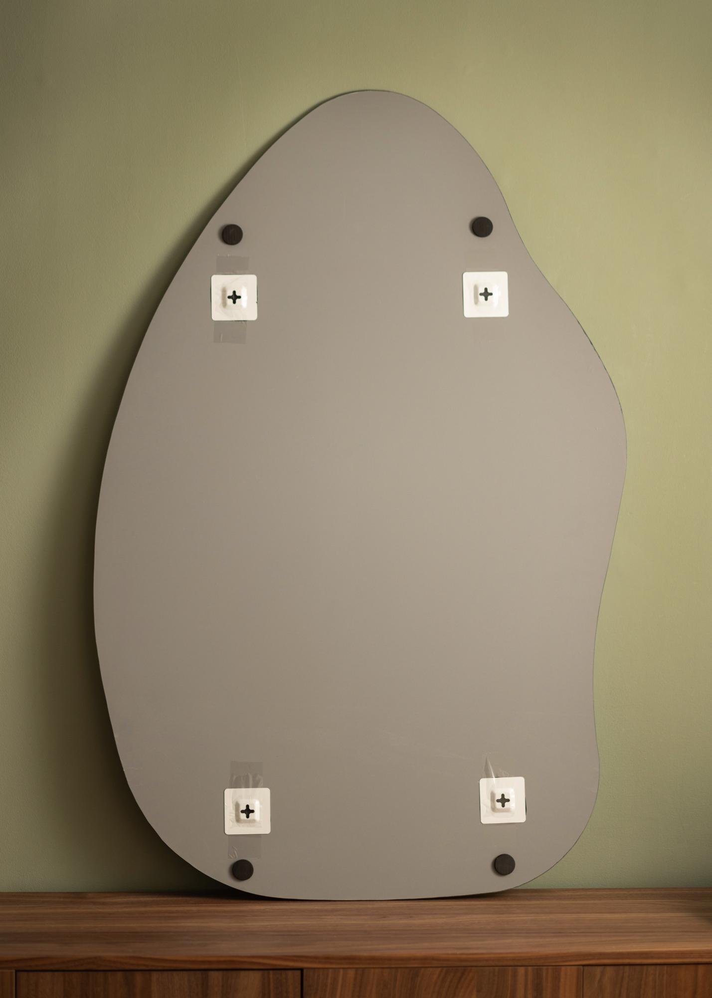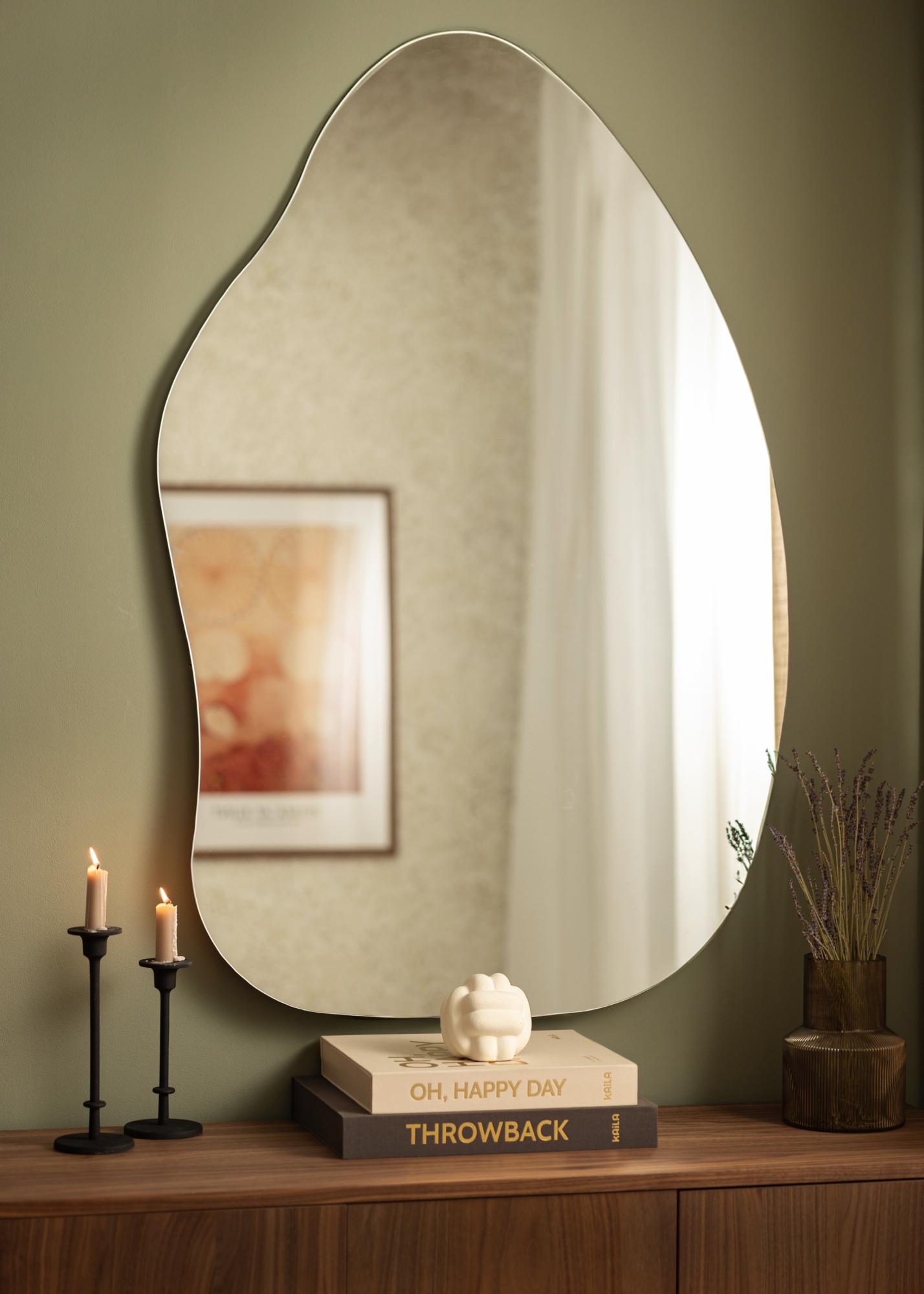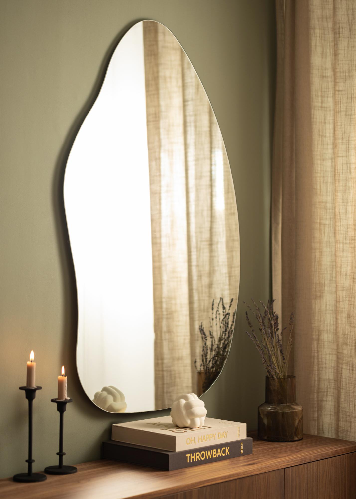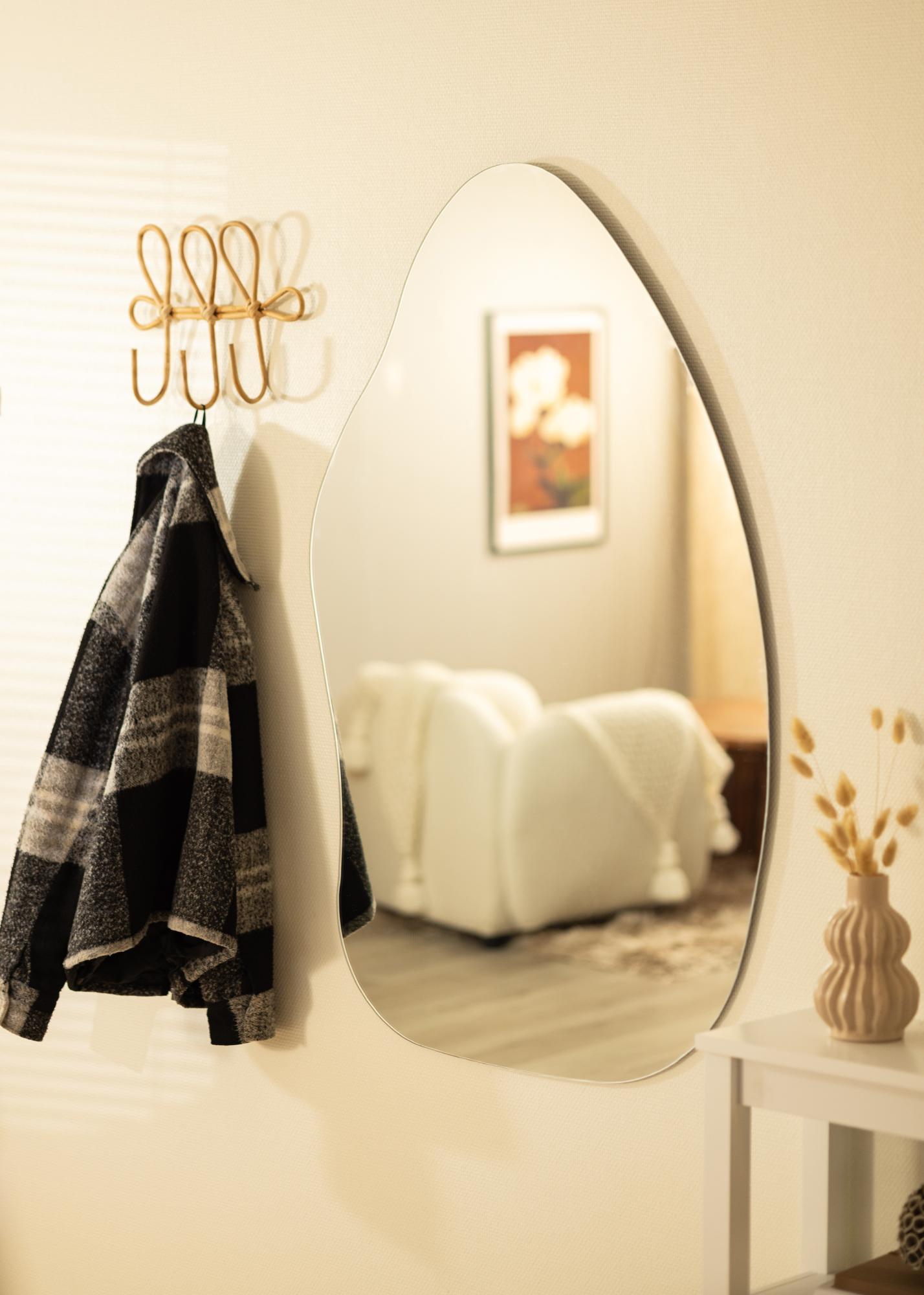 Veidrodis turi švelnią ir organišką formą, primenančią vandens lašą ar stovintį lapą, suteikdamas elegantišką ir modernų pojūtį kambariui. Ši unikali forma padaro veidrodį diskusijų pradžia ir meno kūriniu, tuo pačiu metu atliekant praktinę funkciją.