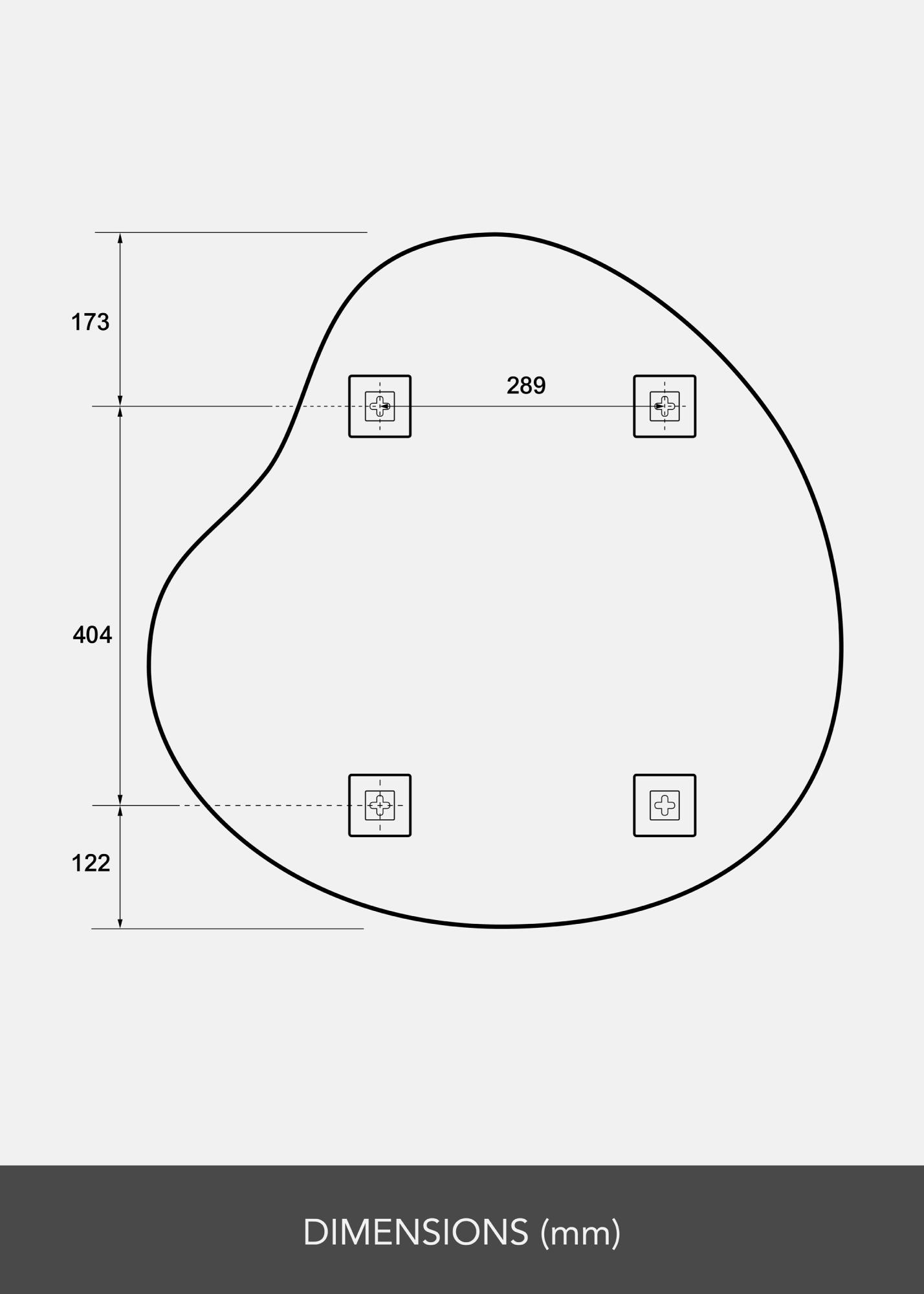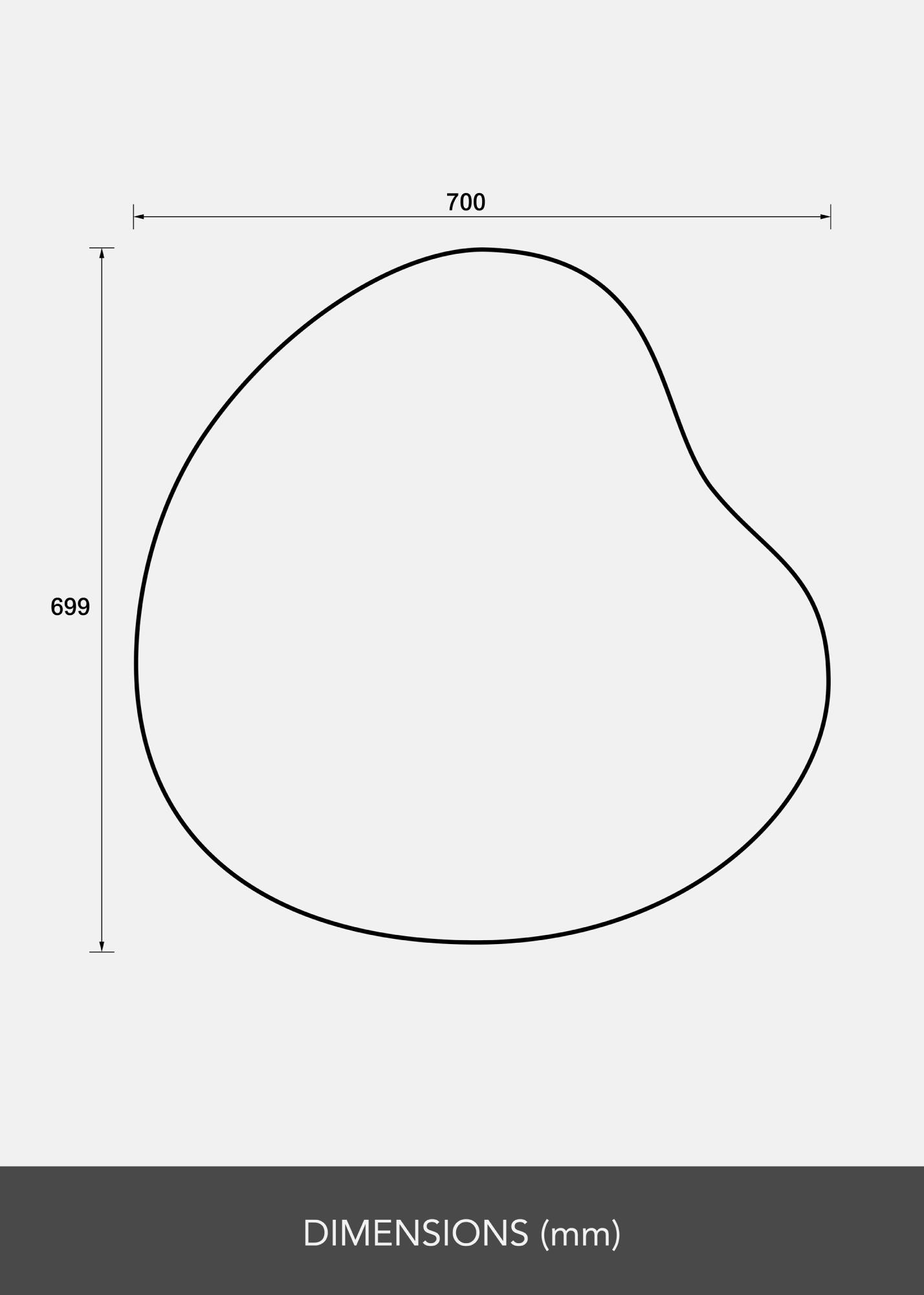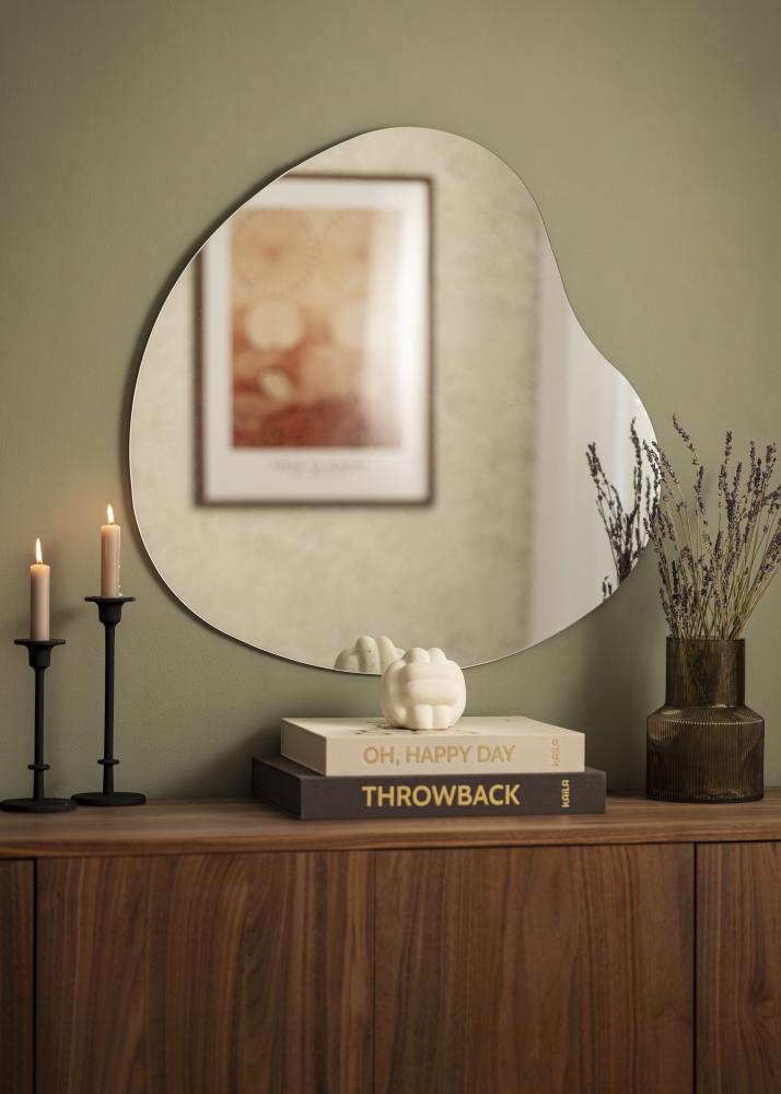 Veidrodis turi švelniai kontūruotą, asimetrinę formą, kuri grakščiai vingiuoja ir sukuria judėjimo bei švelnumo įspūdį. Šis dizainas leidžia veidrodžiui tapti meno kūriniu ant sienos, išlaikant jo praktinę funkciją.