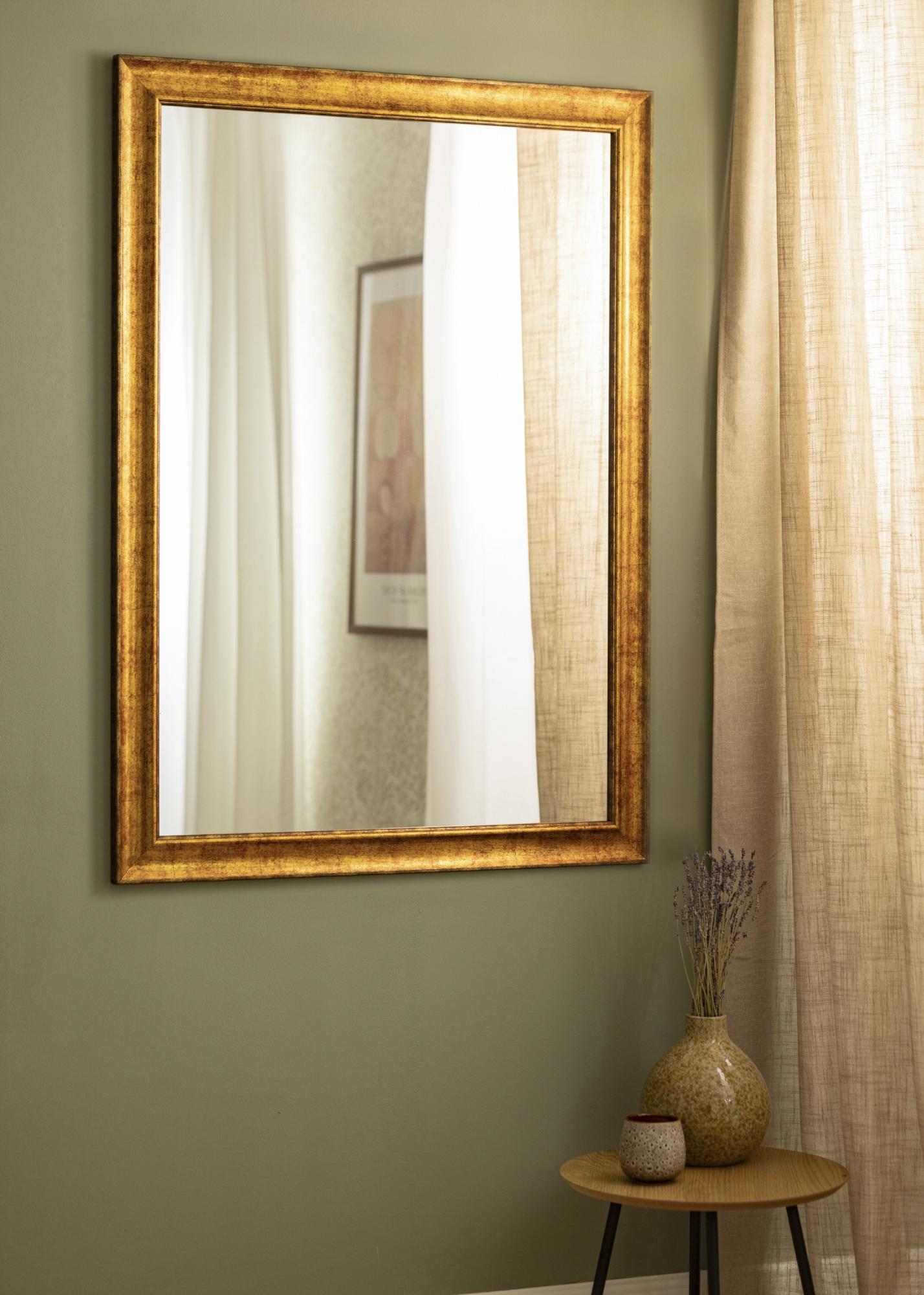 Šis gražus sieninis veidrodis turi dekoratyvų auksinį rėmą, pagamintą iš kompozito. Rėmas turi elegantišką „nusidėvėjusį“ išvaizdą, suteikiančią veidrodžiui senesnį įspūdį, puikiai tinkantį į šiltus ir jaukius namus. Praktinis sieninis kabliukas ant galinės dalies leidžia kabinti veidrodį tiek vertikaliai, tiek horizontaliai. Šio veidrodžio matmenys yra 70x100 cm.