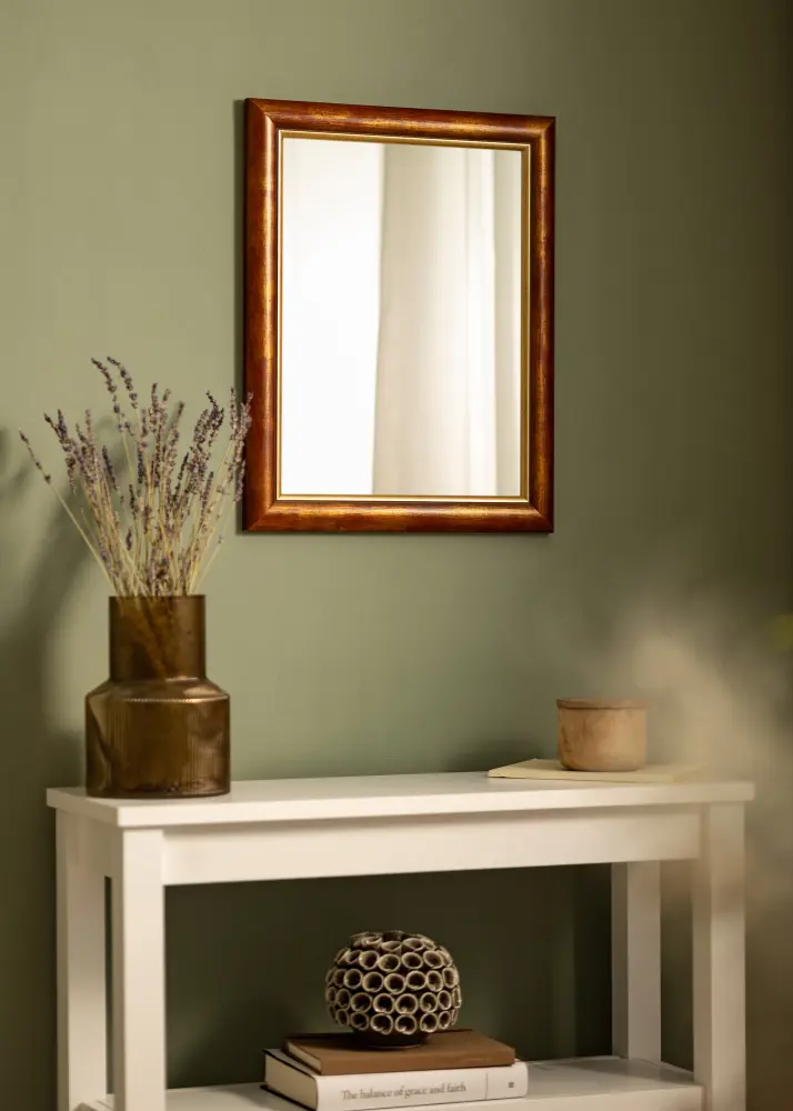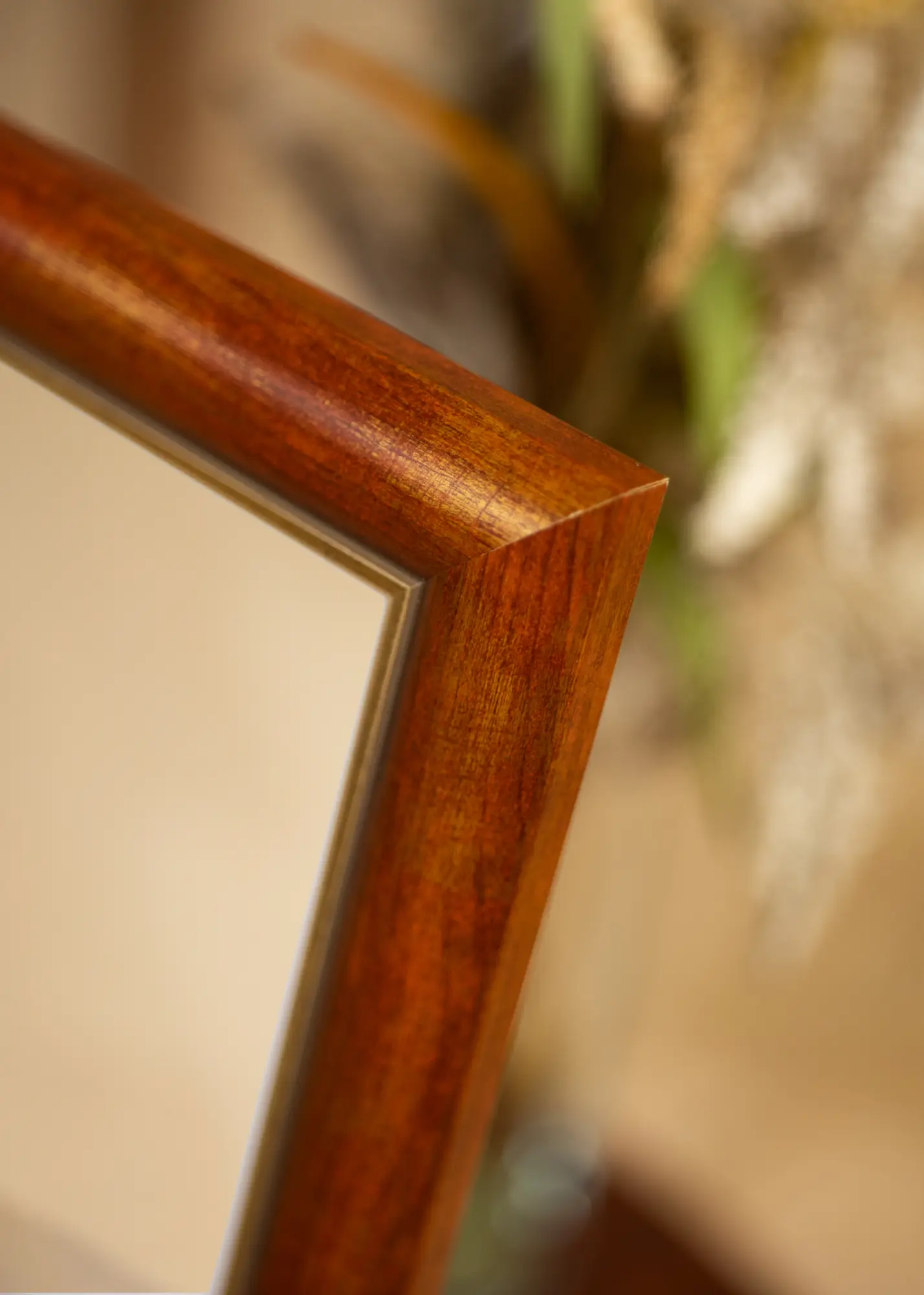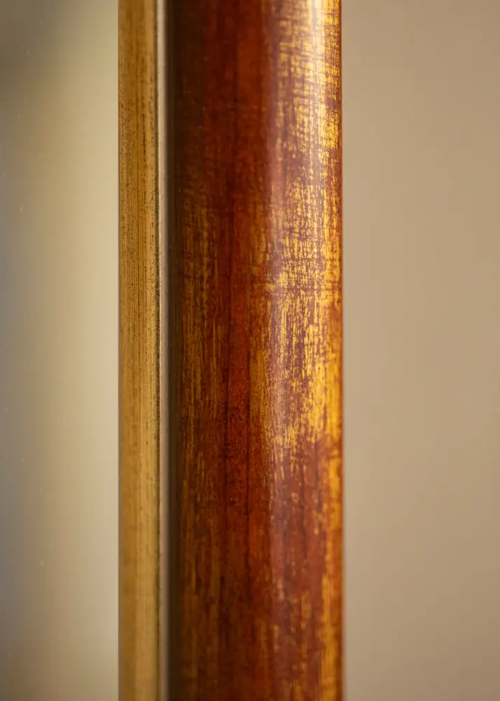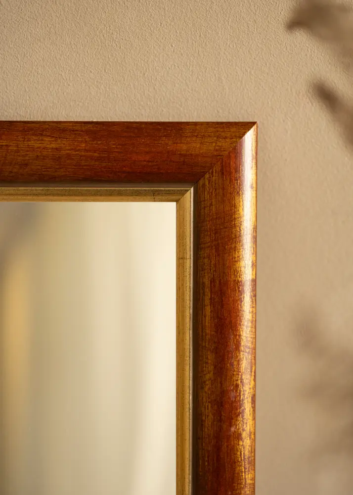 Laikina medinė juostelė, pagaminta Suomijoje, su elegantišku raudonai tonizuotu medienos paviršiumi ir auksiniu kraštu arti veidrodžio stiklo. Rėmas turi platų profilį, kurio plotis yra 41 mm, o gylis 19 mm, kas suteikia papildomą gilumą jūsų veidrodžiui.