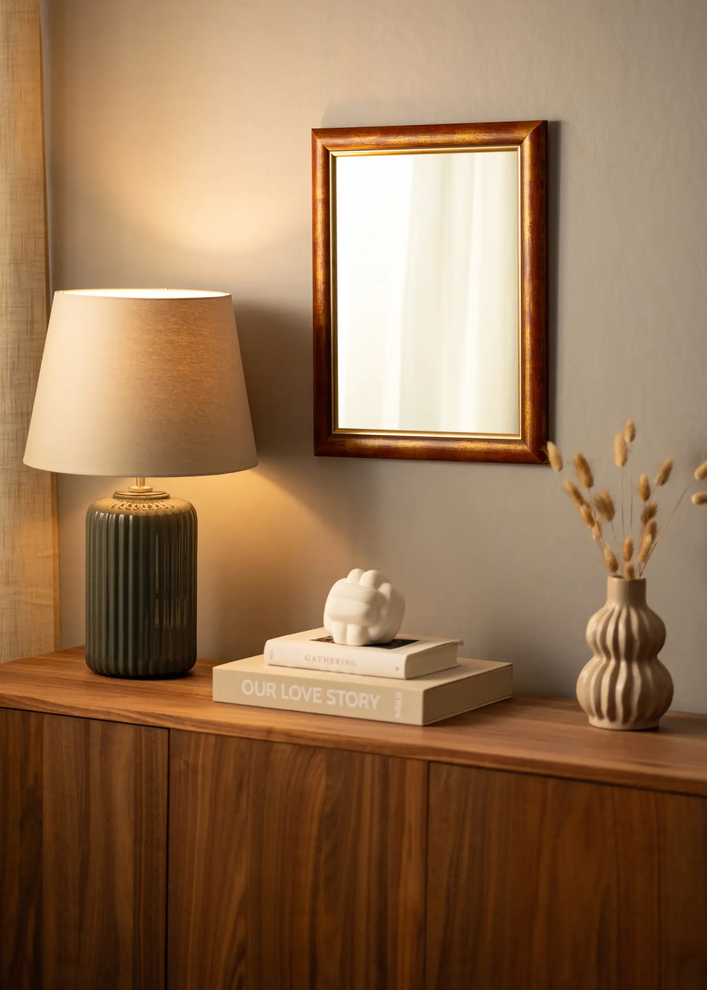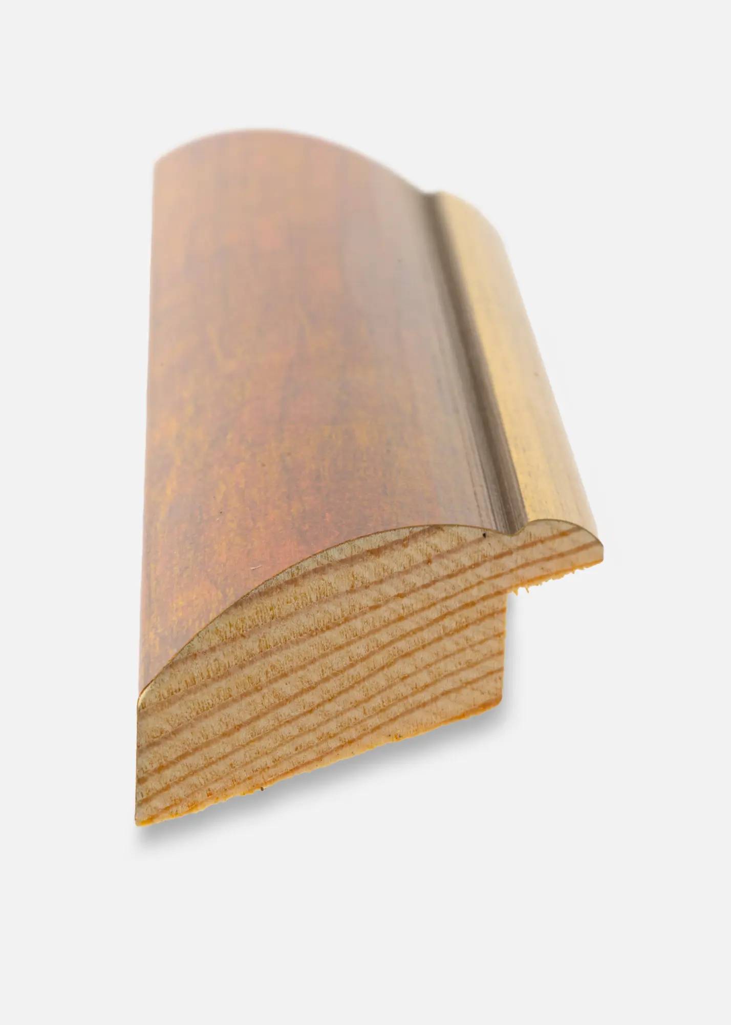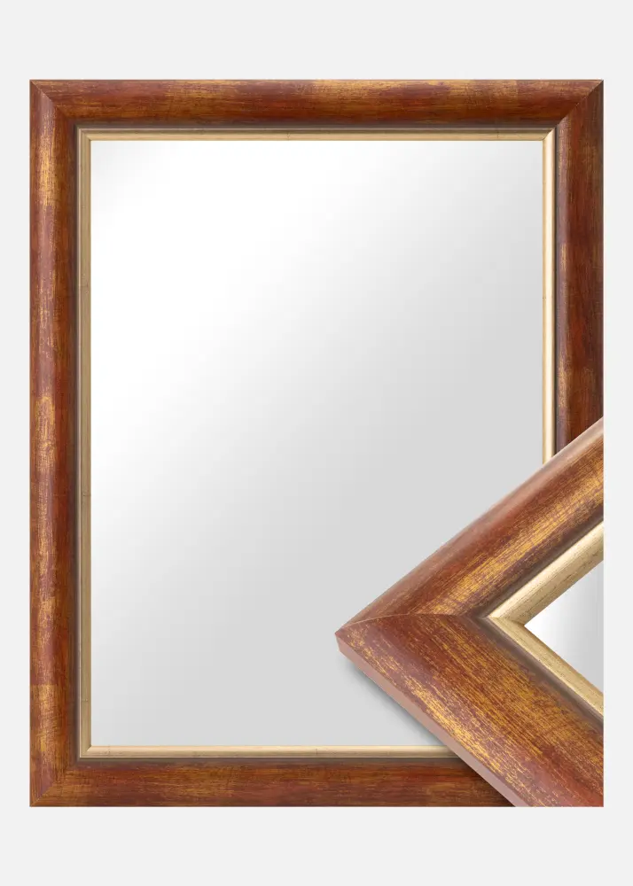 Laikina medinė juostelė, pagaminta Suomijoje, su elegantišku raudonai tonizuotu medienos paviršiumi ir auksiniu kraštu arti veidrodžio stiklo. Rėmas turi platų profilį, kurio plotis yra 41 mm, o gylis 19 mm, kas suteikia papildomą gilumą jūsų veidrodžiui.