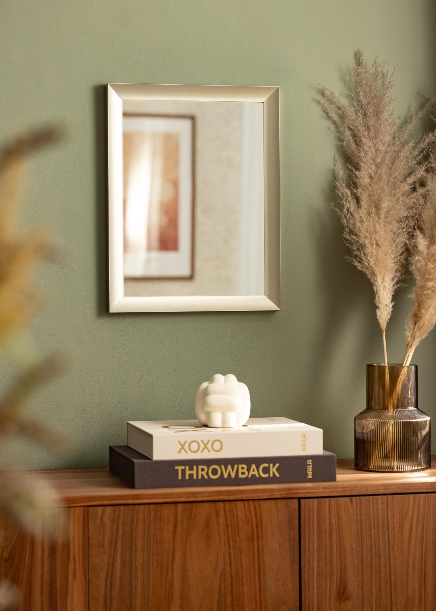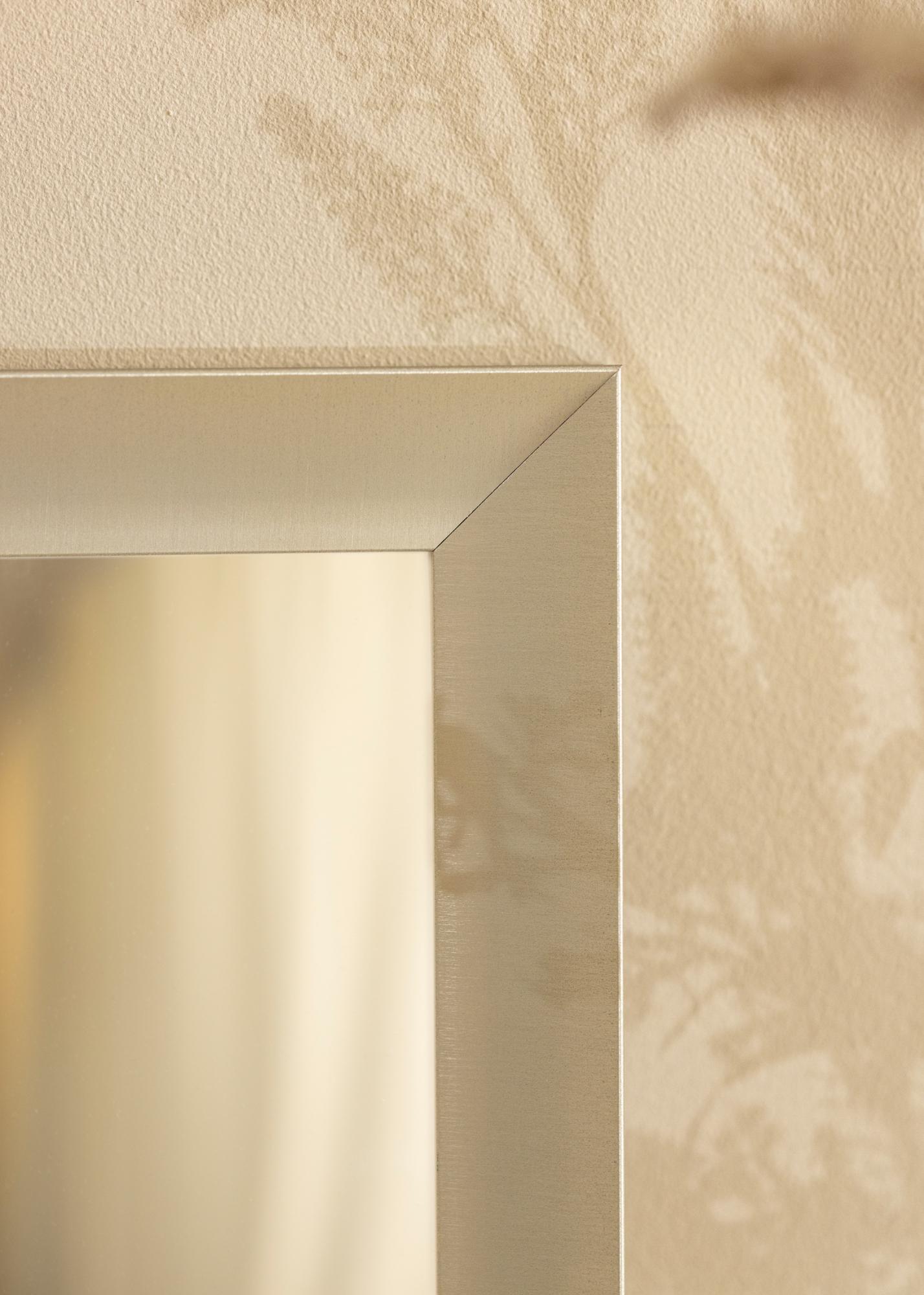 Stilingas veidrodis su deimantinės spalvos rėmu ir suapvalintu profiliu, kuris suteikia švelnų įspūdį, pagamintas iš aukštos kokybės aliuminio. Veidrodžio neutrali spalva ir švari forma leidžia jam derėti prie bet kokių kambarių ir interjerų, tačiau jis geriausiai atrodo kartu su pastelinių spalvų paletėmis. Pakabinkite veidrodį kartu su grafiškomis paveikslių ir nuotraukų juodais rėmeliais bei derinkite su stiklinėmis arba juodomis interjero detalėmis, kad sukurtumėte kambario vienovę.