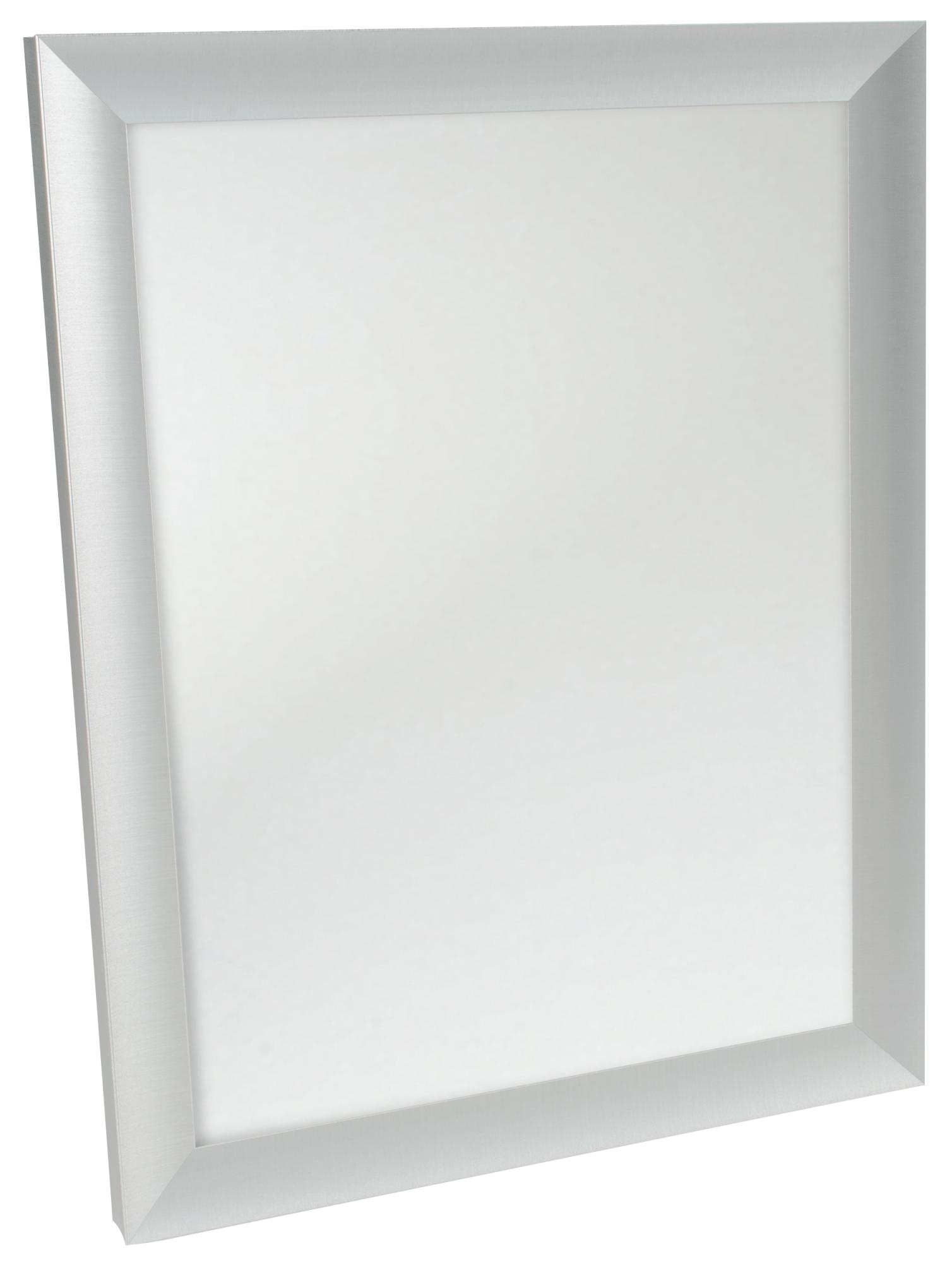 Veidrodis su elegantišku aliuminio rėmu pusiau matinės sidabrinės spalvos, pagamintas Vokietijoje. Stilingas išraiška ir diskreti sidabrinė veidrodžio spalva leidžia jam derėti prie visų tipų interjero stilių ir aplinkų, tačiau jis ypač gerai tinka prie švelnių spalvų arba aplinkoje su atspalviais iš vien tik pilkos spalvos paletės. Derinkite veidrodį su paveikslais, kurių rėmai yra sidabriniai, juodi arba balti, arba pakabinkite virš elegantiškos šoninės lentynos kaip akcentą.