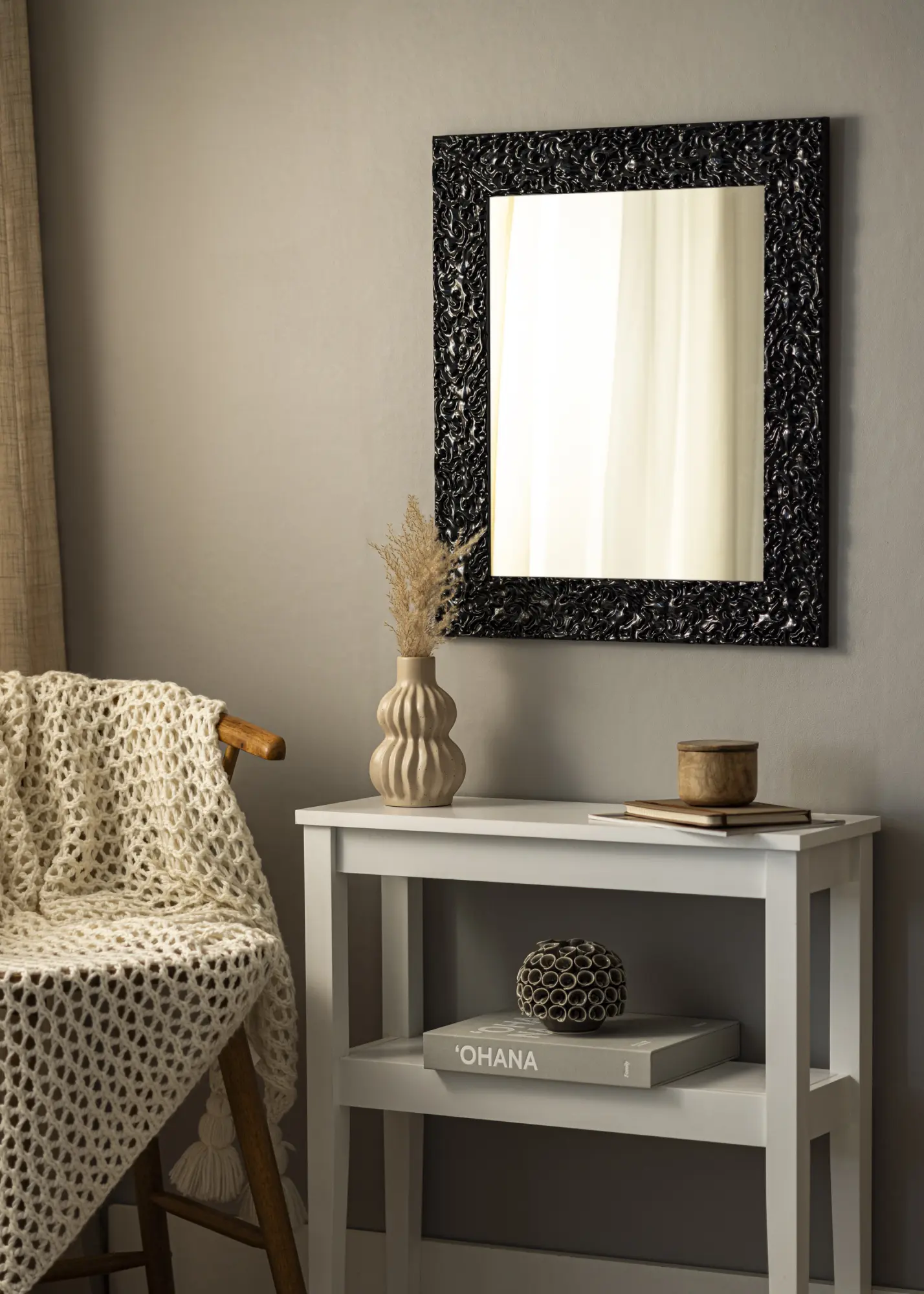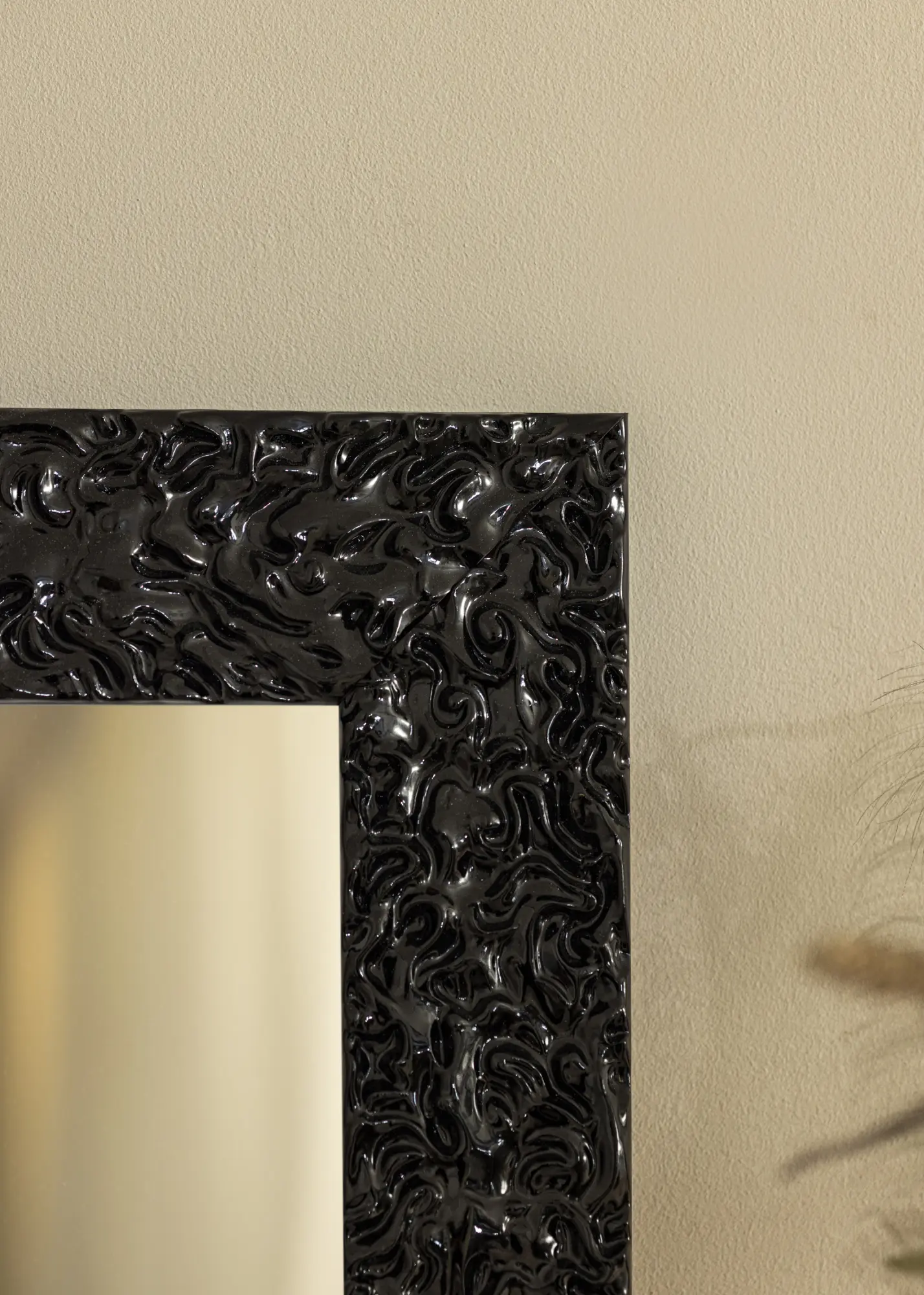 Veidrodis Westminster Juodas yra pagal užsakymą gaminamas veidrodis, kurį gaminame mes, todėl galite jį gauti būtent tokio dydžio, koks geriausiai tinka jūsų namams. Dėl savo sodriai juodos spalvos ir aukštos blizgios paviršiaus apdailos šis veidrodis tampa elegantiška bet kurio kambario puošmena. 81 mm pločio rėmo juosta suteikia veidrodžiui tvirtą įrėminimą, o organinis raštas ant paviršiaus sukuria gyvą ir dramatišką efektą.