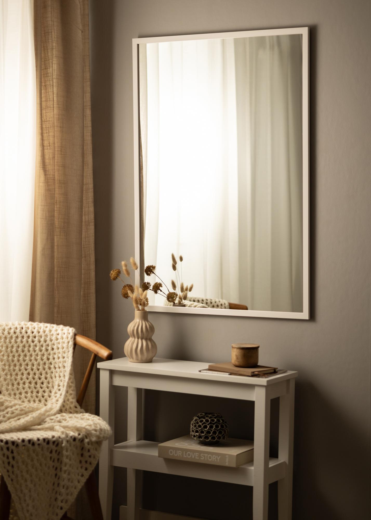 Veidrodis priklauso sieninių veidrodžių serijai su įvairiais dizainais, iš kurių šis yra 70x100 cm dydžio variantas su balta rėmu.