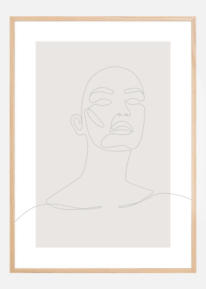 Unikalus abstraktus portreto plakatas su veidu, sudarytu iš vienos linijos. Plona juoda linija be pastangų juda per puslapį, kad vienu brūkštelėjimu sukurtų visą veidą. Švelni pilka fono spalva užtikrina, kad atkreipsite dėmesį į paveikslą, norėdami įvertinti visas detales.