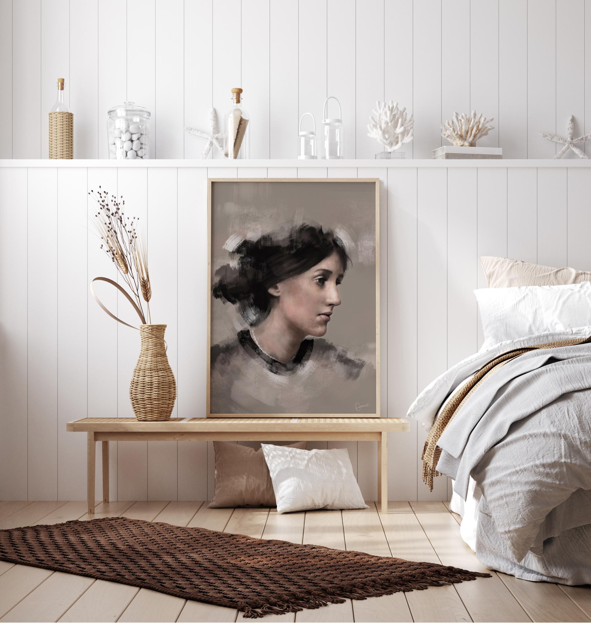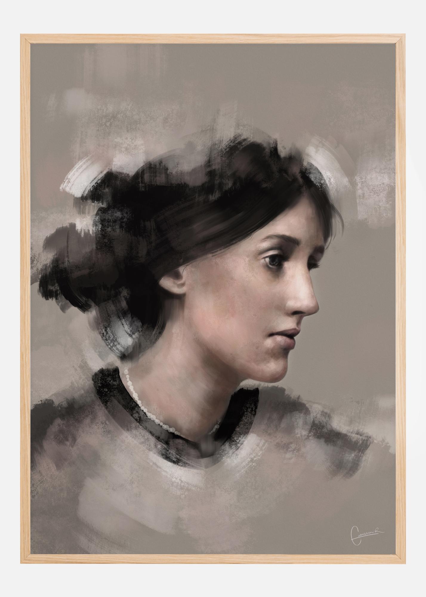 Portreto plakatas su Virginia Woolf profilyje. Jos plaukai yra paprastos, švelnios spalvų dėmės, tačiau jos veidas perteikiamas kruopščiomis detalėmis. Portretas yra švelnus ir moteriškas, suteikiantis beveik melancholišką atspalvį jos veidui, kai ji žvelgia į tolį.