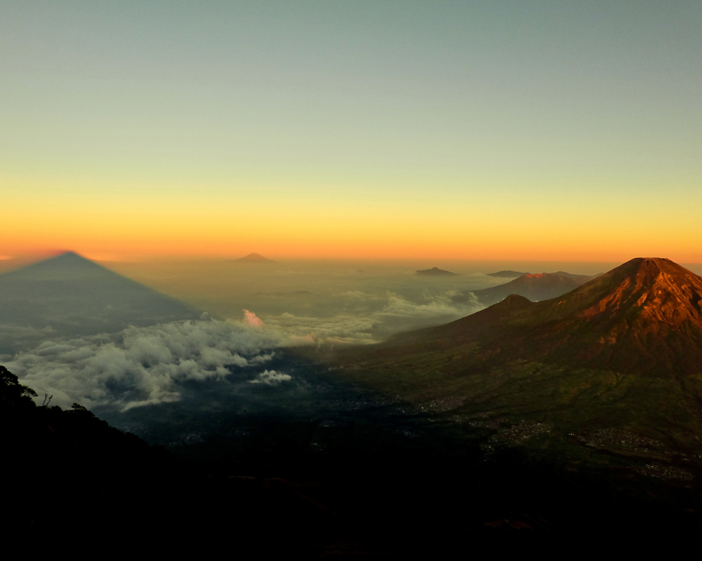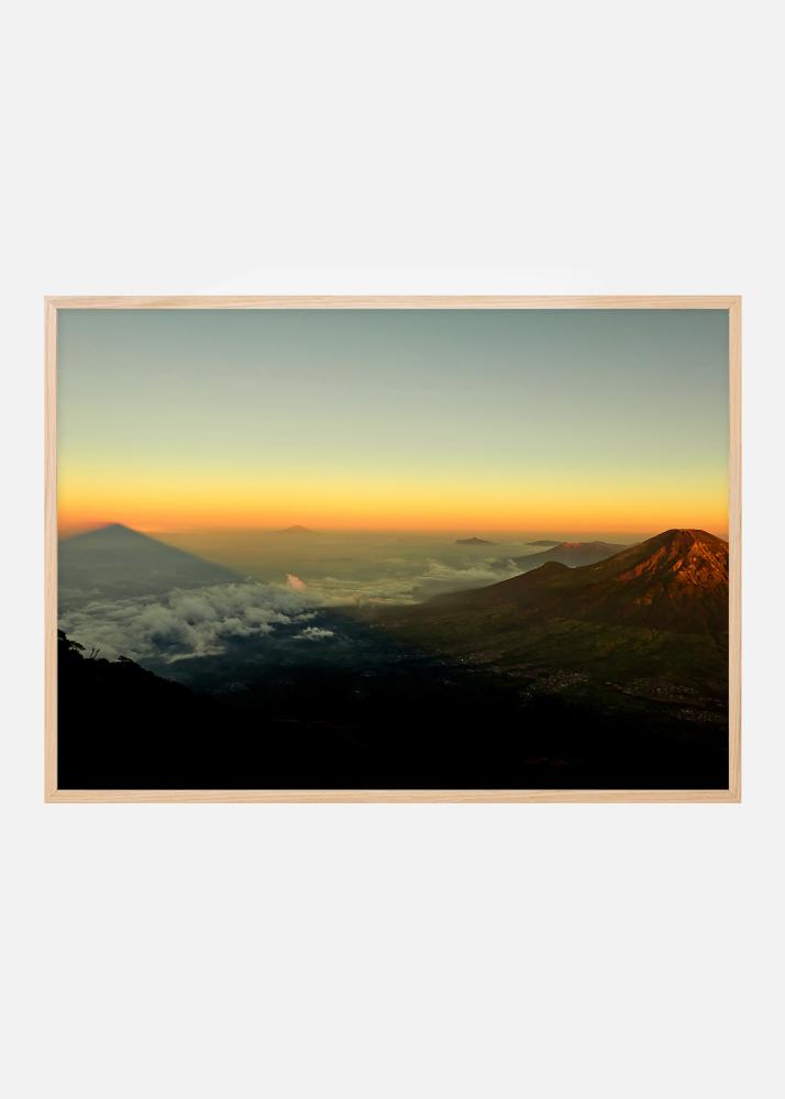 Atvaizdas su didingu vaizdu iš viršaus debesų virš dantytų kalnų auštant. Geltonai oranžiniai dangaus spalvų tonai ir tamsus priekinis planas suteikia vaizdui dramatišką išraišką, kuri traukia akį. Vaizdas tinka visiems interjero stiliams dėl savo elegantiško vaizdavimo, derinkite su rėmeliu, kuris išryškina paveikslo spalvas.