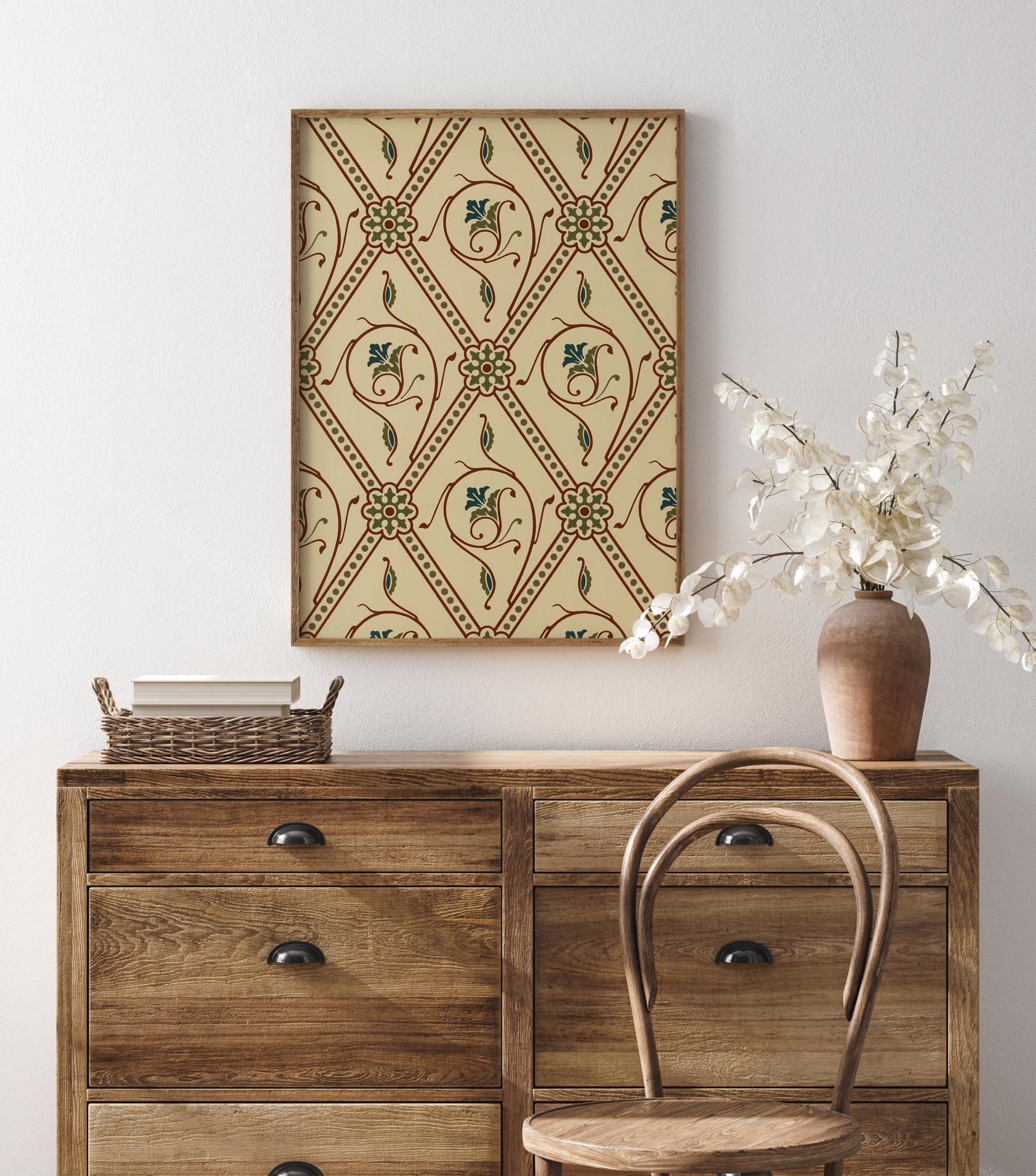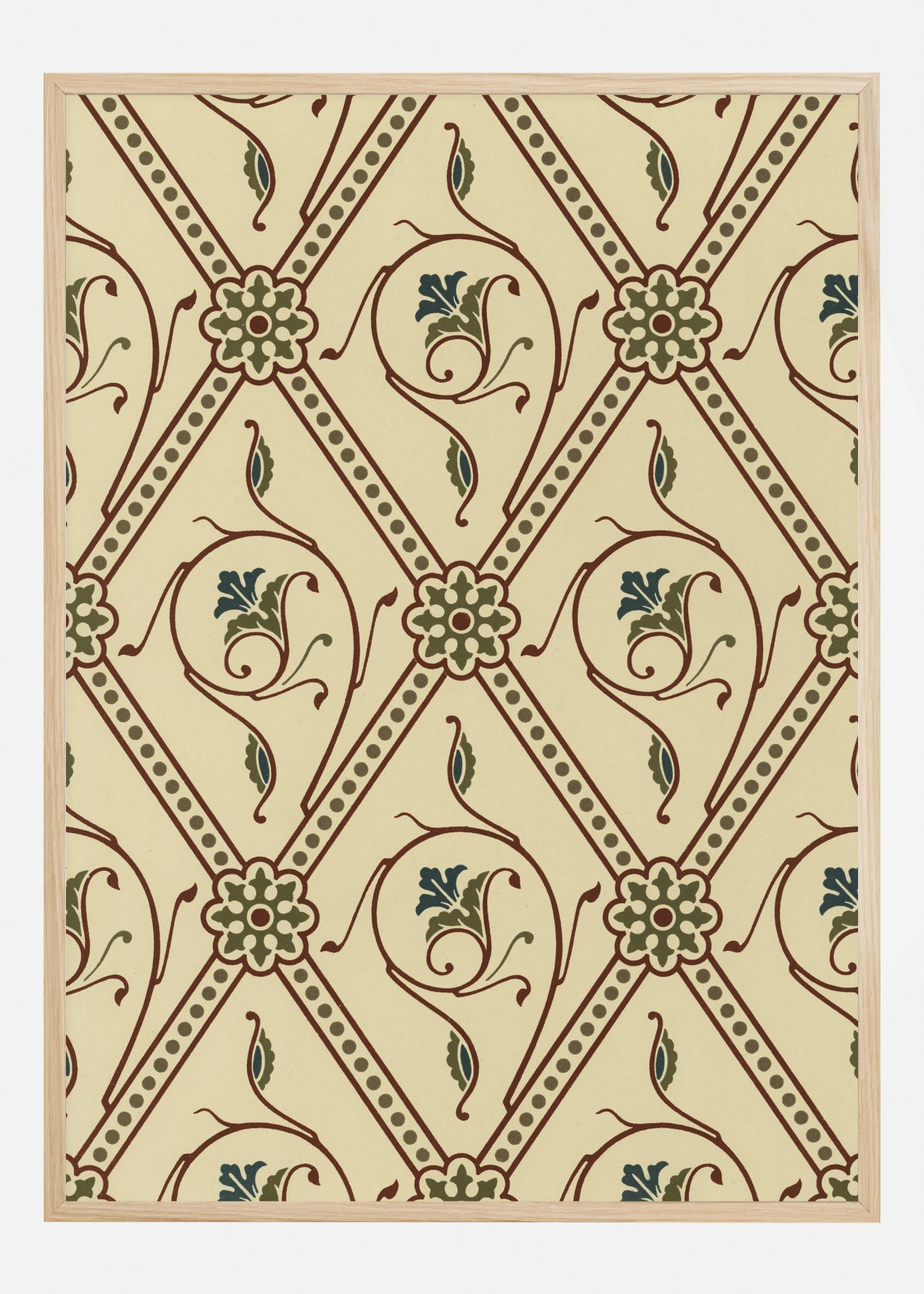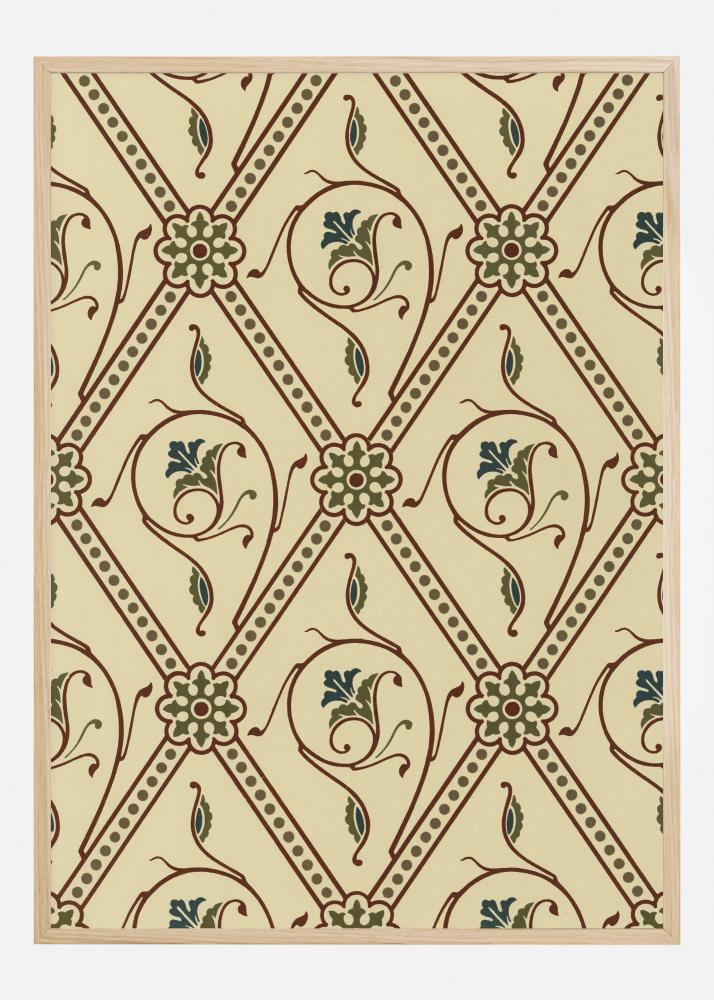 Tapetų plakatas su kreminiais, raudonais ir žaliais raštais. Dideli deimantai formuoja pagrindines raštų ribas. Kiekvienoje iš jų viduje yra serija vingiuotų raudonų linijų, baigiasi žaliais ir mėlynais lapų ir gėlių motyvais. Raštas yra elegantiškas ir tekantis, tai puikus būdas pagyvinti lygų sieną su kažkuo šiek tiek kitokiu.