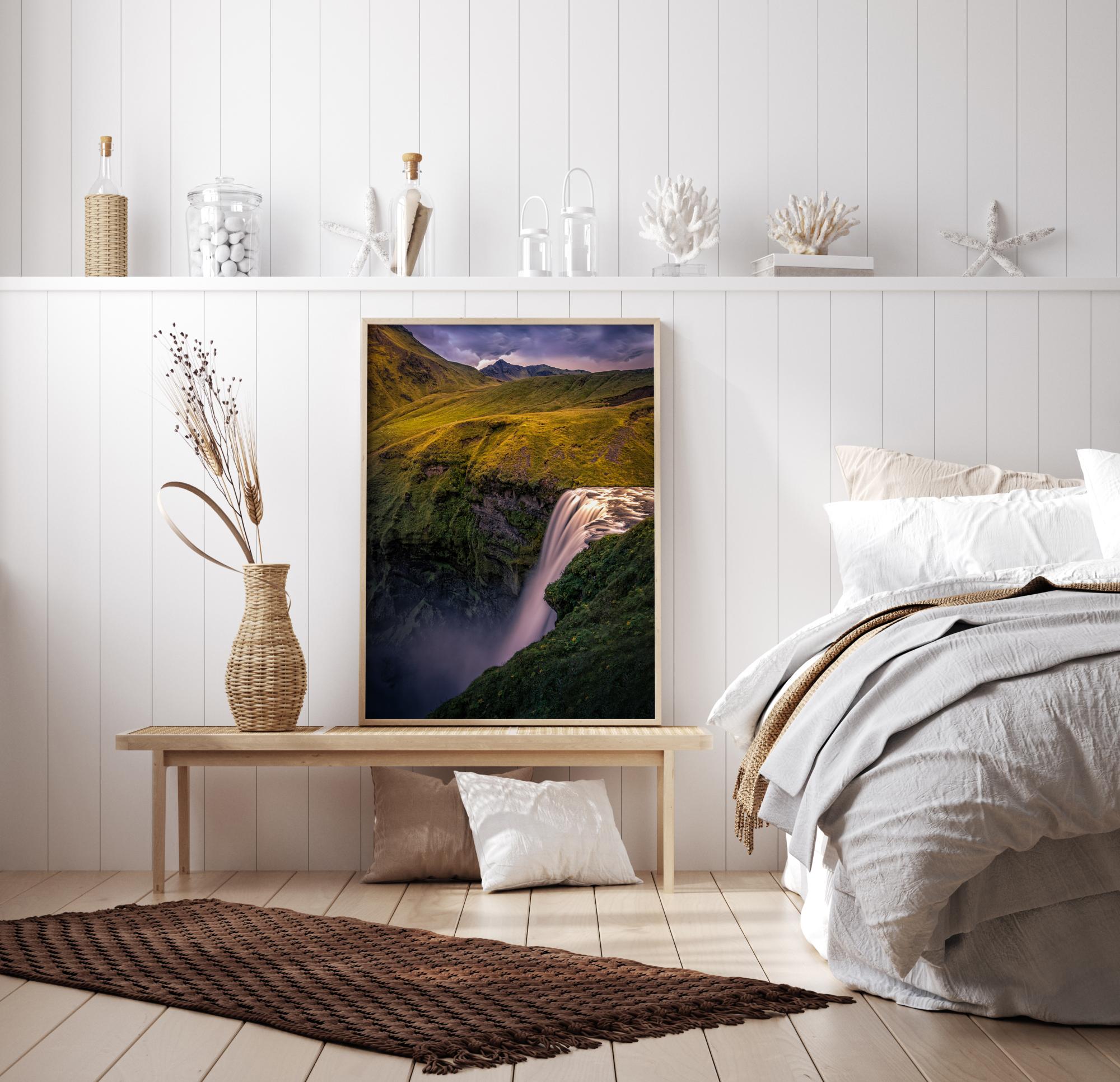 Galingas sceninis plakatas su kriokliu, krentančiu per uolos kraštą į nežinomą gelmę apačioje. Aplink krioklį yra šviesiai geltonos ir žalios kalnų viršūnės. Žvilgsnis pagaunamas balto vandens srauto, kai jis krenta nuo uolos ir sukuria rūką, kuris vėl kyla aukštyn.