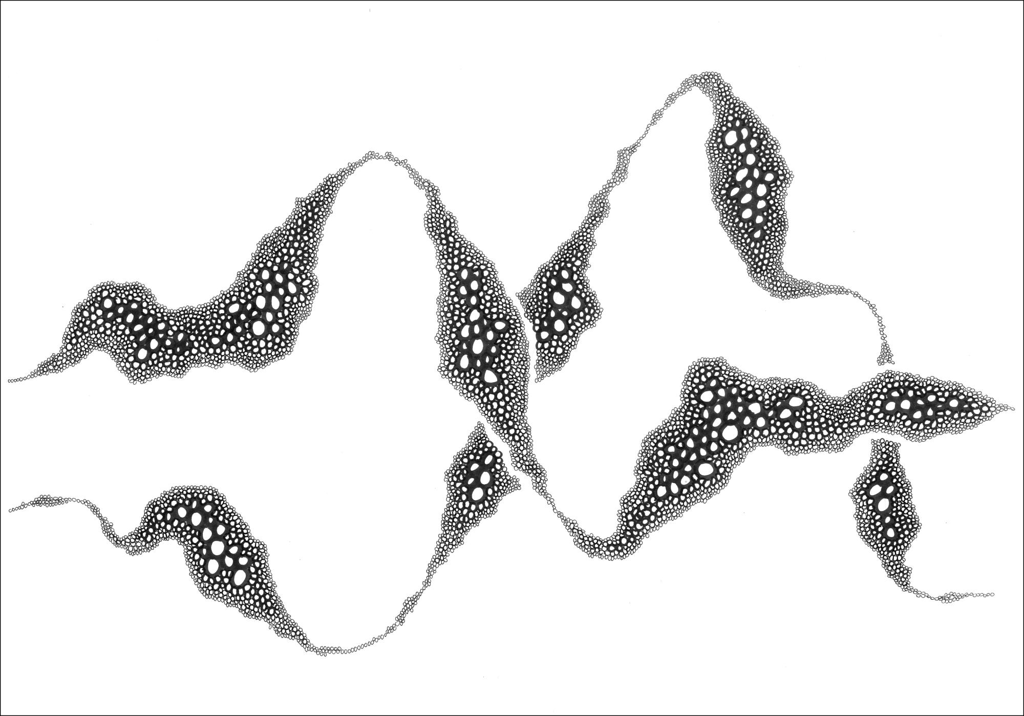Drąsus abstraktus plakatas su skirtingais juodais ir baltais apskritimais, kurie sukuria keistas banguojančias bangas baltame fone. Yra dideli ir maži apskritimai kaip burbulai, kurie prilipę prie ilgų banguojančių virvelių, kurios vingiuoja ir sukasi per paveikslą, kirsdamos vieną kitą šiuo keistai žavingu darbu.