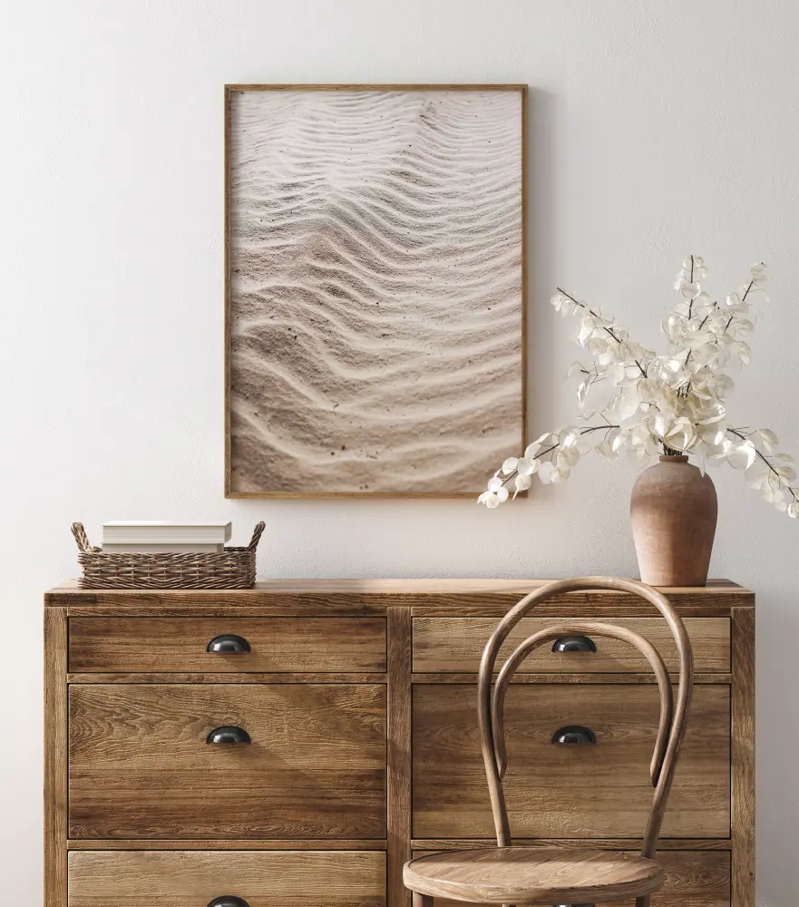 Raštuotas plakatas su smėlio raibulių stambiu planu. Žavėkitės, kaip vėjas sukuria švelnias bangas smėlyje, kai šie raibuliai kyla į baltą šviesą plakate. Pasinerkite į šią smėlingą nuotrauką.
