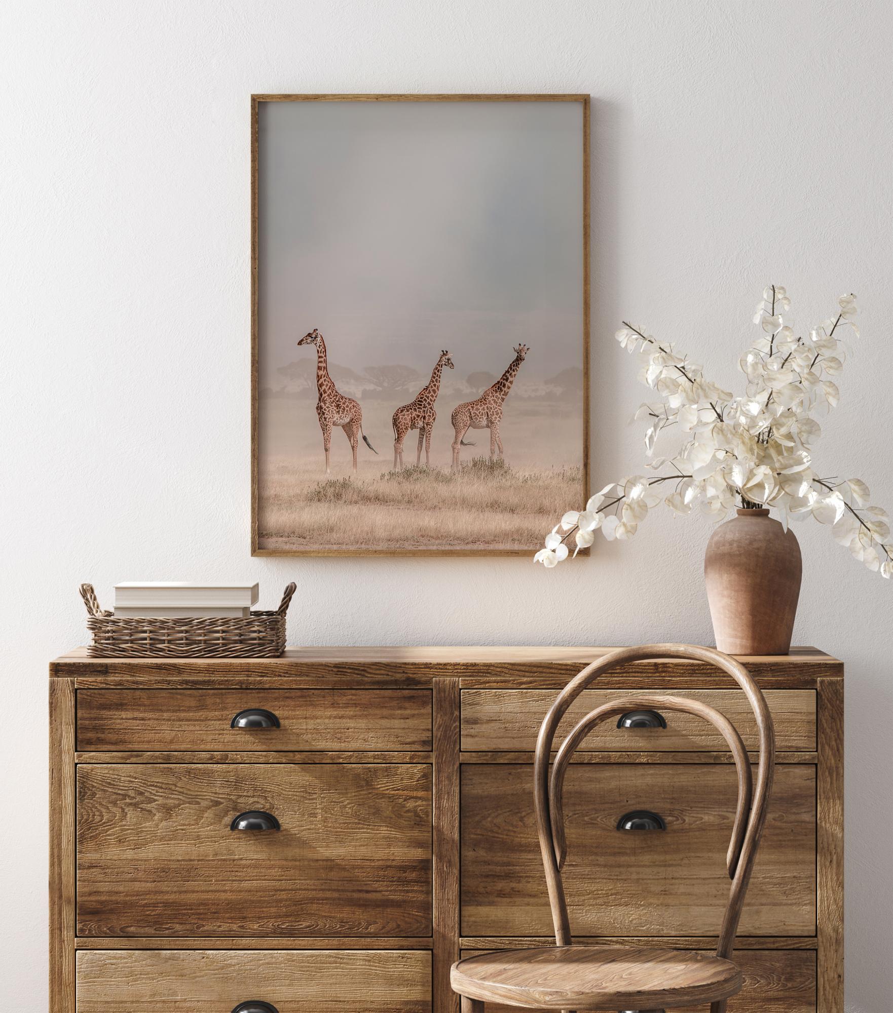 Graži laukinės gamtos išraiška su trimis žirafomis Afrikos savanoje. Žirafos žiūri į skirtingas puses, kai jos kovoja su Amboselio dulkių vėjais, kurie sukasi spiralėmis ir sukuria miglotą efektą. Aplankykite Afriką neišeidami iš namų su šiuo jausmingu plakatu.