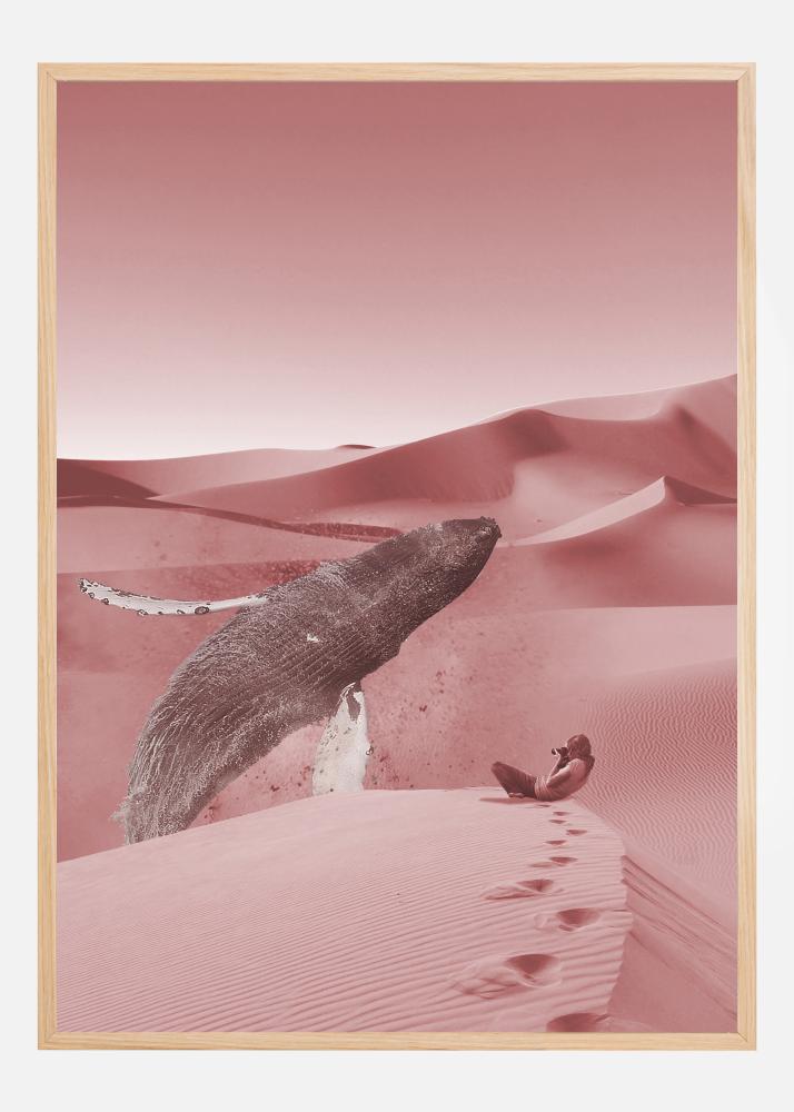 Svajokite apie siurrealistinį pasaulį su šiuo meniniu plakatu, kuriame galingas banginis iškyla iš besikeičiančio rožinių smėlio kopų kraštovaizdžio. Šis netikėtas jūros milžino ir dykumos banguojančių kalvų derinys meta iššūkį realybei ir vilioja žiūrovą į fantazijos pasaulį. Rožinė atspalvis, persmelkianti vaizdą, suteikia ramybės ir žaismingumo jausmą, o aiškūs pėdsakai veda mus į istoriją, kuri laukia būti tyrinėjama.