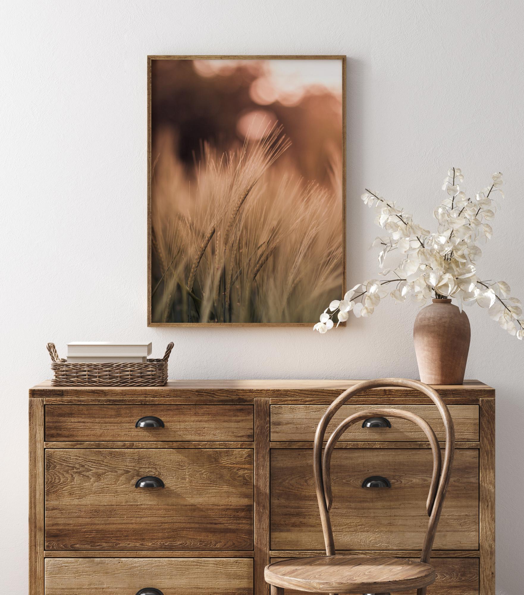 Minkštas plakatas su kviečių varpomis vėlyvos popietės saulėje. Švelni rožinė šviesa matoma ant auksinių kviečių metų, sukuriant minkštą, beveik stebuklingą vaizdą. Paverkite kasdienybę į kažką gražaus, pakabindami šį atspaudą ant švelnios neutralios sienos, kad sukurtumėte ramias nuotaikas.