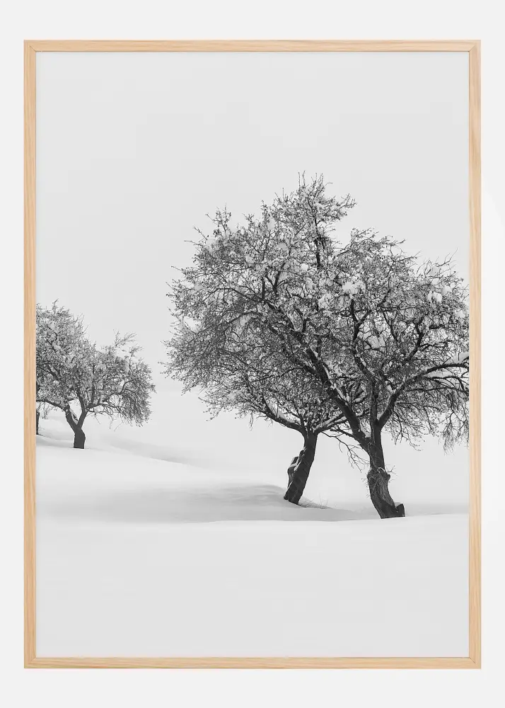 Sniego plakatai su medžiais, kurie prasiveržia per snieguotą kraštovaizdį. Lygi balta sniego danga tęsiasi tol, kol užmato akis. Juodos kamienai ir šakos nuostabiai išsiskiria prieš baltą sniegą ir dangų. Pajuskite tą Kalėdų nuotaiką, kai pakabinsite jį namuose.