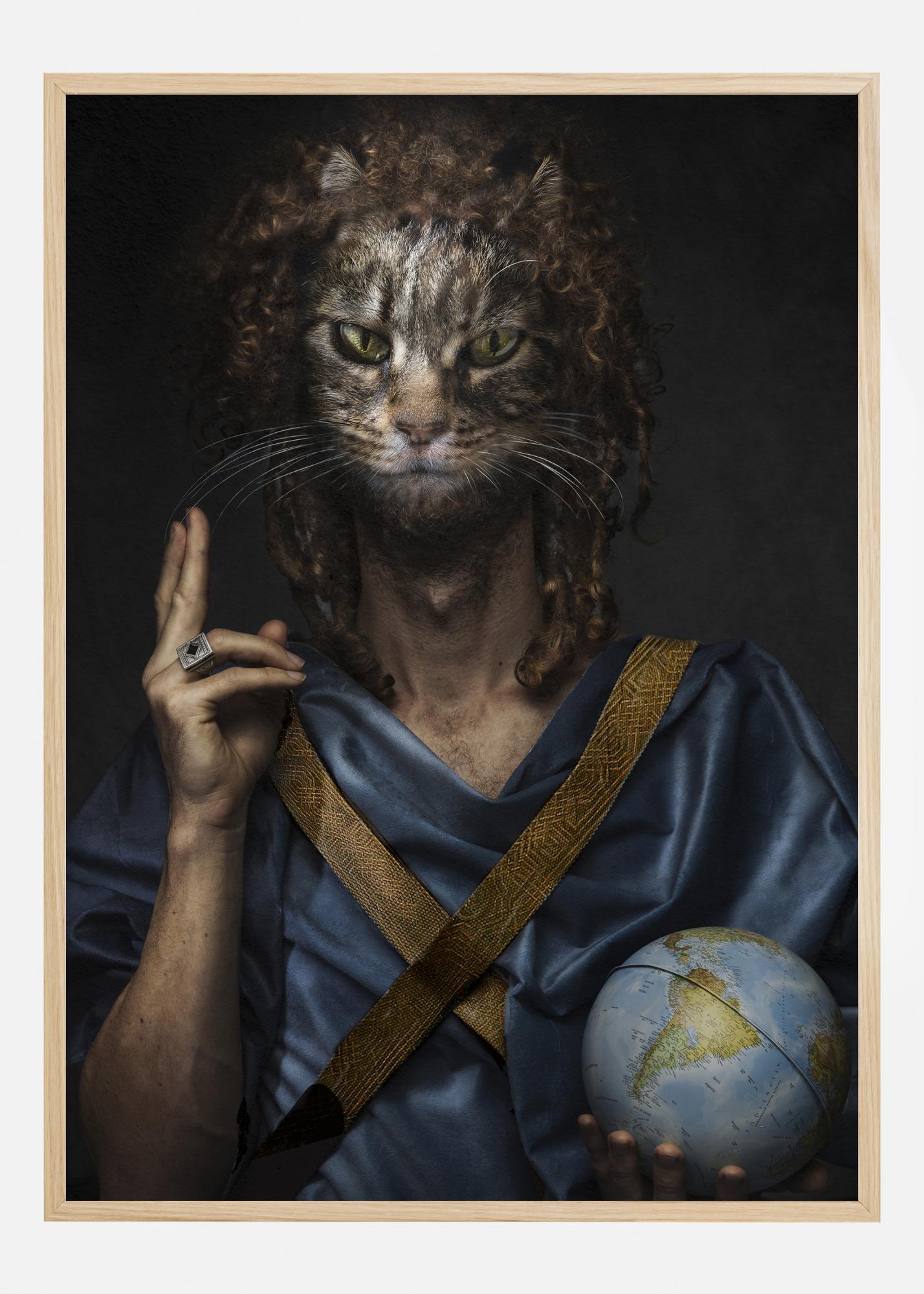 Šis unikalus plakatas rodo išskirtinį ir apmąstymus sukeliantį vaizdą, kuriame katės galva yra uždėta ant žmogaus pavidalo figūros. Motyvas vaizduoja gilią, tamsią foną, kuri ryškiai kontrastuoja su figūros šviesiu, aštriu žvilgsniu. Žmogiškoji figūros dalis apsirengusi turtingu mėlynos spalvos tuniku, su aukso detalėmis, suteikiančiomis elegancijos ir stiprybės jausmą. Figūros ranka laiko senovinį pasaulio gaublį, kuris prideda išminties ir visapusiško suvokimo dimensiją. Vaizde dominuoja spalvos, tokios kaip gili mėlyna, auksas, taip pat rudos ir smėlio tonai, kurie susilieja, sukurdami plakatą, kuris yra tiek mistiškas, tiek ikoniškas.
