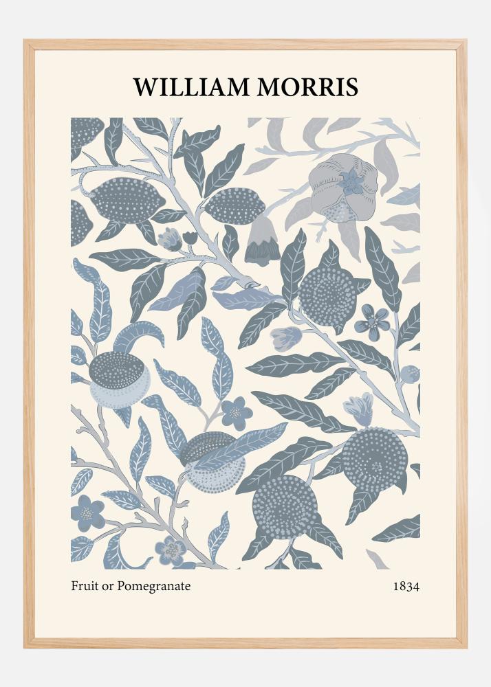 Šis detalėmis turtingas ir stilingas plakatas rodo William Morris' ikonišką dizainą "Fruit or Pomegranate", čia pavaizduotą gaiviu ir elegantišku spalvų deriniu. Sofistikuotas granatų derinys su įvairiomis lapų formomis ir gėlėmis suteikia jausmą gyvos ir žydinčios gamtos. Plakato subtili spalvų paletė, su mėlynos ir pilkos atspalviais kremuoto fono atžvilgiu, sukuria sofistikuotą ir šiuolaikišką įspūdį, kuris puikiai tinka į daugelį skirtingų interjero stilių.