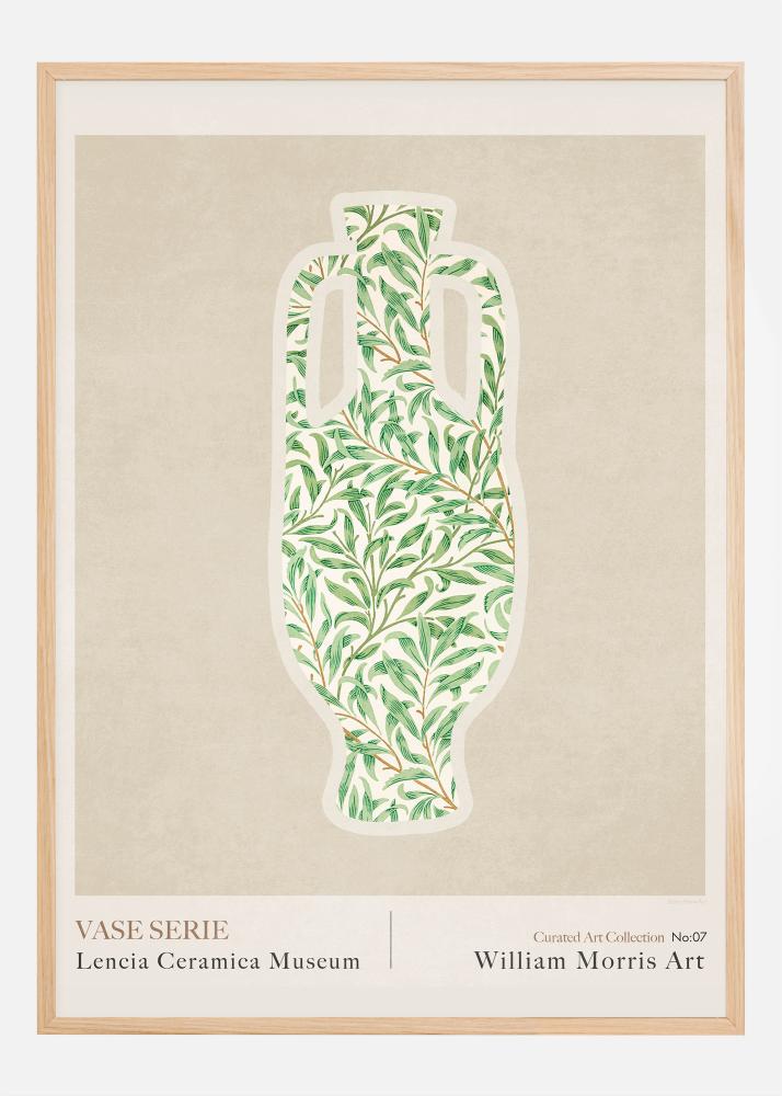 Šis subtilus ir gamtos įkvėptas plakatas yra numeris 07 mūsų "Curated Art Collection" iš Lencia Ceramica muziejaus, kuris švenčia William Morris' meninį paveldą. Jis vaizduoja klasikines vazos kontūras, užpildytas vienu iš Morris’ išskirtinių žalių augalų raštų, kas rodo jo meistrišką būdą sujungti formą ir funkciją su estetiniu grožiu dizaine. Tai yra laikui nepavaldi duoklė Morris’ vizijai ir jo gebėjimui semtis įkvėpimo iš gamtos ir paversti ją menu.