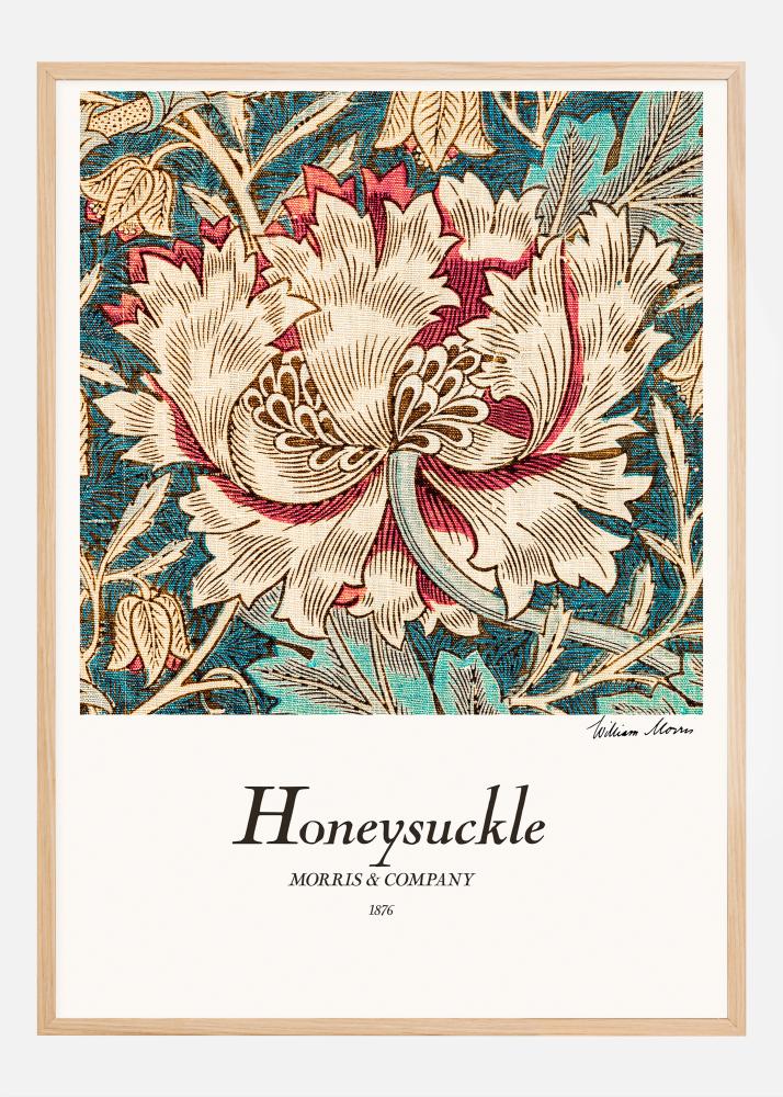 Šis plakatas pristato „Honeysuckle“, išskirtinį Williamo Morris modelį, sukurtą Morris & Company 1876 metais. Raštas yra turtingas gėlių audinys su vijoklinių sausmedžių vingiuojančiomis kreivėmis ir gėlėmis, turinčiomis gražių raudonų, kreminių ir mėlynų atspalvių. Fonas, gilesnės mėlynos spalvos tonas, išryškina elegantiškai suformuotas gėles ir lapus, sukuria gilią ir sudėtingą kompoziciją, kuri yra tiek patraukli, tiek amžinai graži.