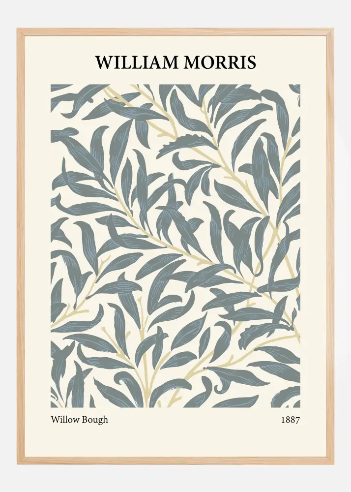 Šis meniškai sukurtas plakatas pagerbia Williamą Morrisą ir jo nesenstančius 1887 metų raštus "Willow Bough". Gyva ir dinamiška gluosnio lapų kompozicija ant kreminio fono yra klasikinis Morriso meilės gamtai ir jo meistriškumo kuriant detalizuotus tekstilės raštus atvaizdas. Ramios ir šaltos mėlynos bei žalios spalvų paletės suteikia ramybės ir tylos jausmą, kuris daro šį dizainą mylima klasika.