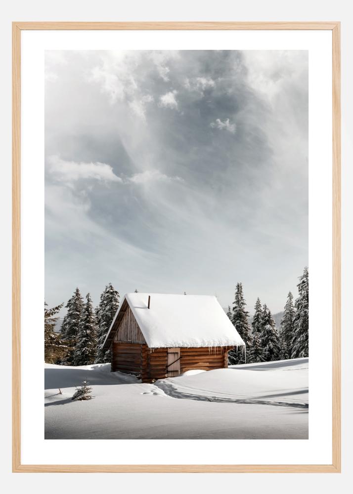 Kalėdinis plakatas su maža medine trobele snieguotame kraštovaizdyje. Minkštas sniegas dengia žemę ir namelio stogą šiame žiemiškame paveiksle. Eglės yra padengtos sniegu, o tamsiai pilki sniego debesys užpildo dangų, pasiruošę suteikti daugiau sniego. Pajuskite žiemos šaltį šiame elegantiškame spaudinyje.