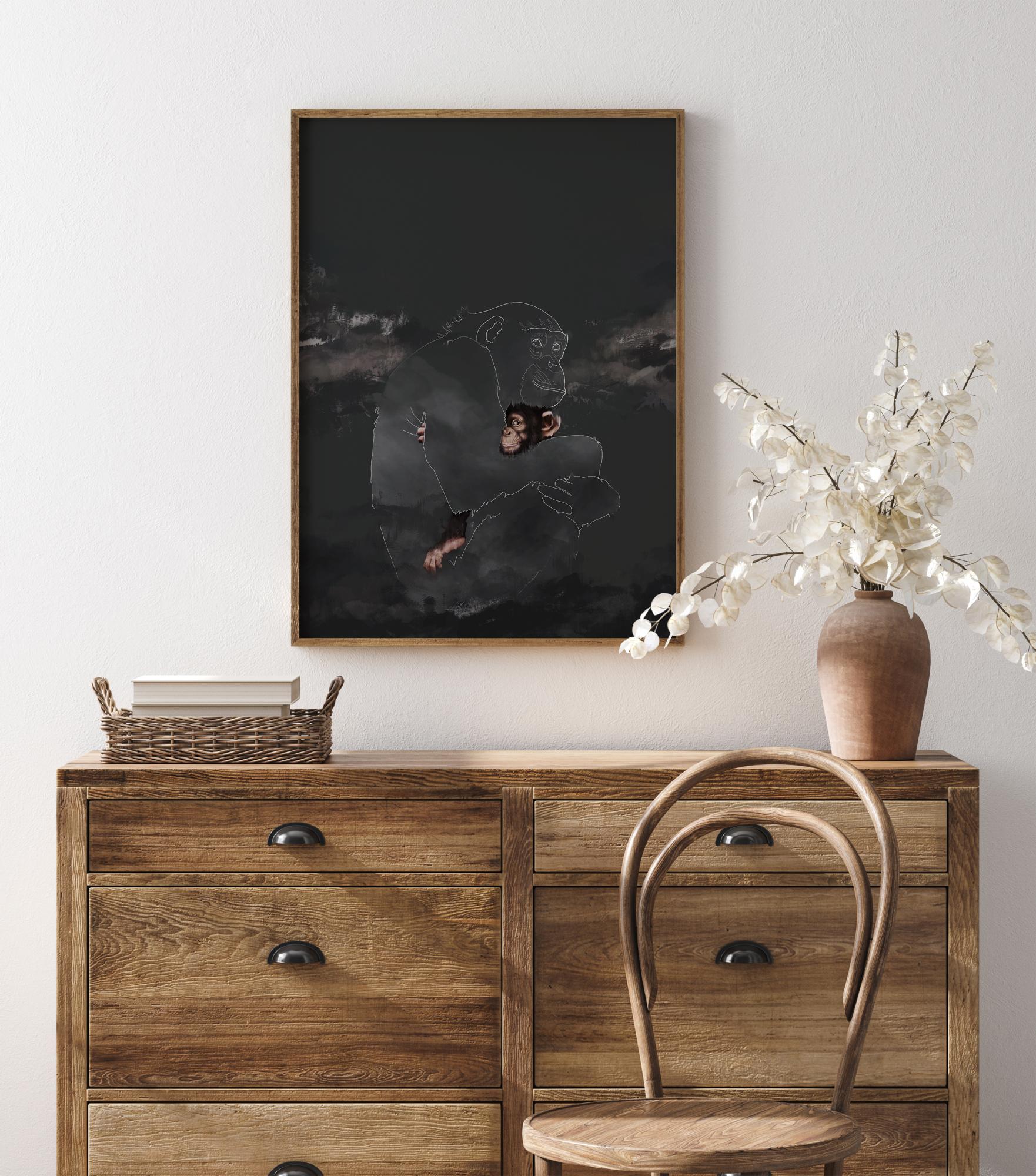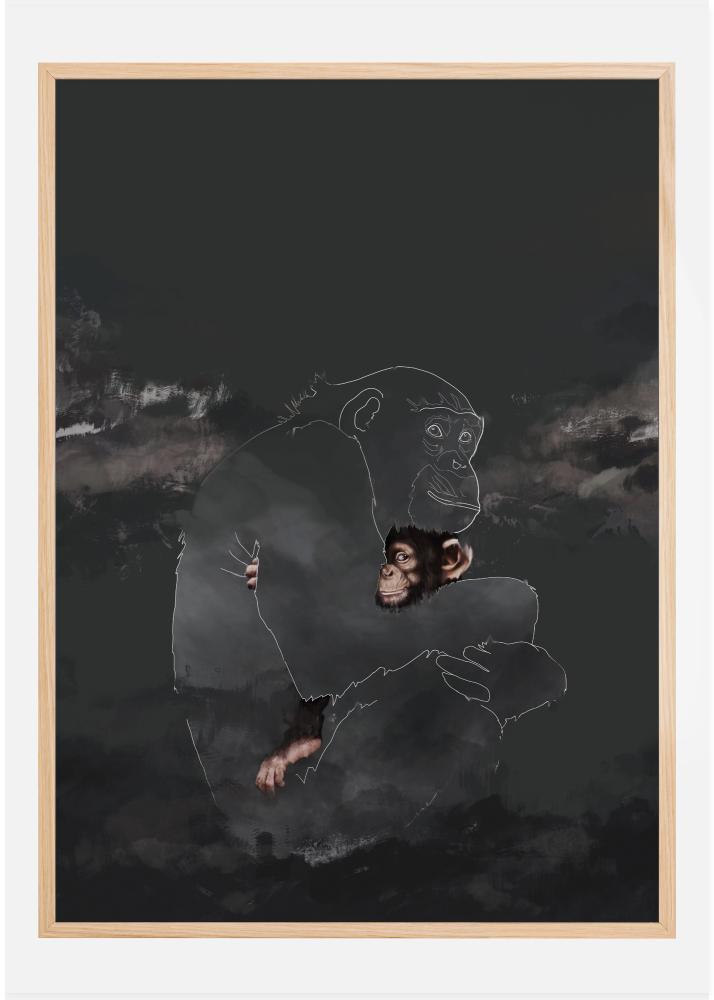 Jaudinantis plakatas su šimpanzės jaunikliu, apkabinusiu dingusios motinos paveikslą. Tai įtaigus vaizdas, kai šimpanzių vaikas apkabina nieką kitą, tik motinos kontūrus, sėdinčius ant minkštų debesų juodame danguje.