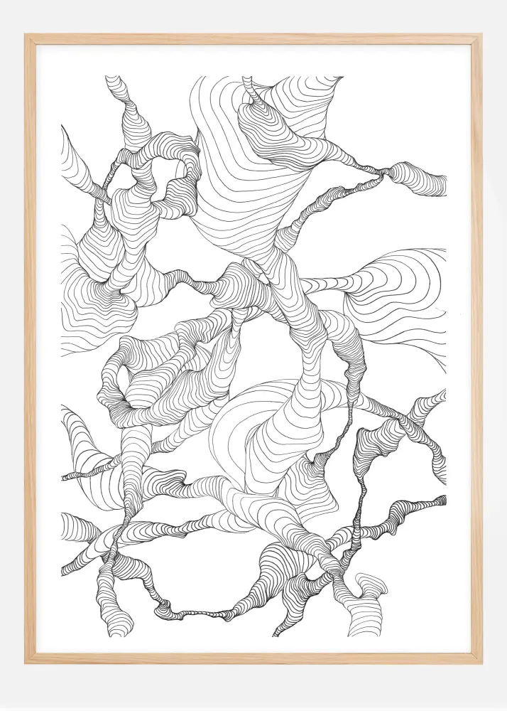 Geometrinis plakatas, pilnas keistų spiralinių vamzdžių, besisukančių po spaudiniu. Kiekvienas iš šių kirminų turi didesnes ir mažesnes sekcijas, sukuriančias banguojančias formas šviesiai pilkos spalvos. Pakabinkite jį ant sienos prieškambaryje, kad galėtumėte pradėti pokalbį apie šį keistą dizainą.