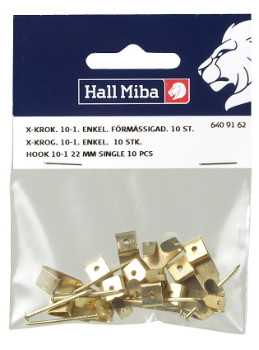 Žalvario spalvos X formos kabliukas, skirtas montuoti į medieną arba gipso sieną. Gali atlaikyti iki 5 kg apkrovą.