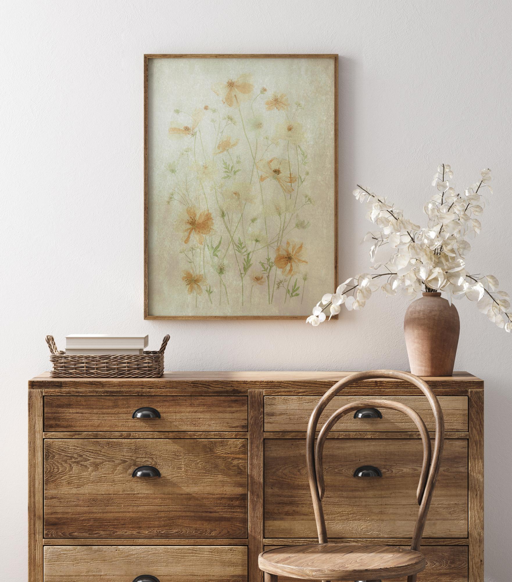 Elegantiškas plakatas su švelniomis oranžinėmis gėlėmis ir žaliais lapais baltame fone. Akvarelės efektas suteikia kiekvienam iš šių augalų minkštumo ir trapumo. Ir vis dėlto kiekvienoje iš jų yra nuostabių detalių šiame švelniame, gėlių paveiksle. Paverskite savo namus Edeno sodu, kai parsinešite šį gėlių spaudinį.