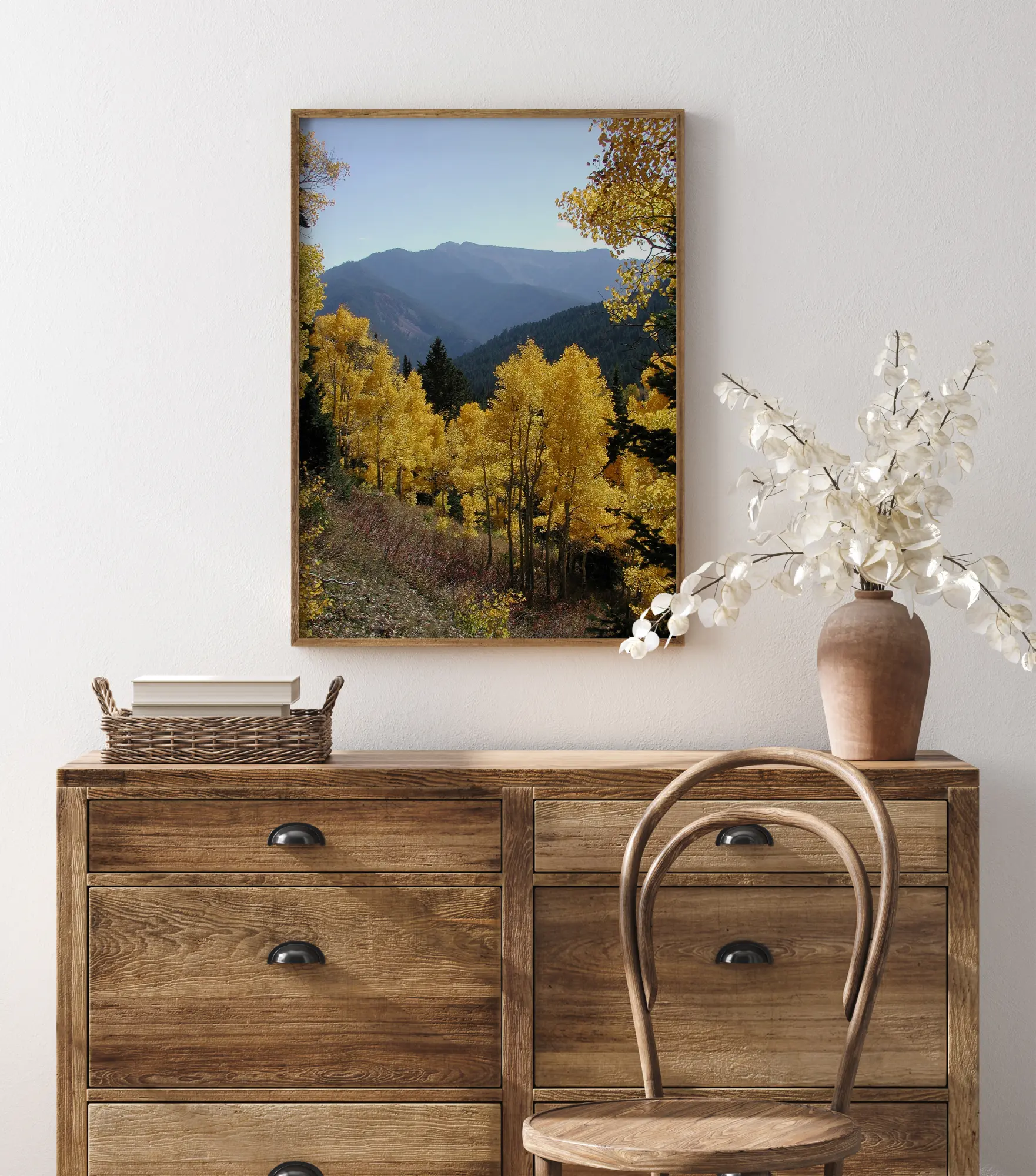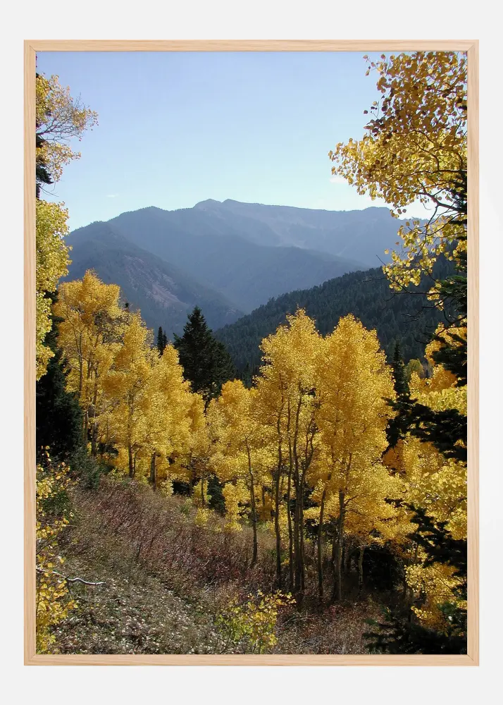 Šviesus kraštovaizdžio atspaudas su geltonais medžiais ir mėlyna kalnų grandine fone. Geltoni medžiai sukuria tikrą vėlyvos vasaros jausmą, kuris nušviečia šį miško vaizdą. Pajuskite šiltą vėją, kuris pučia per kalną šiame ankstyvo rudens paveiksle.