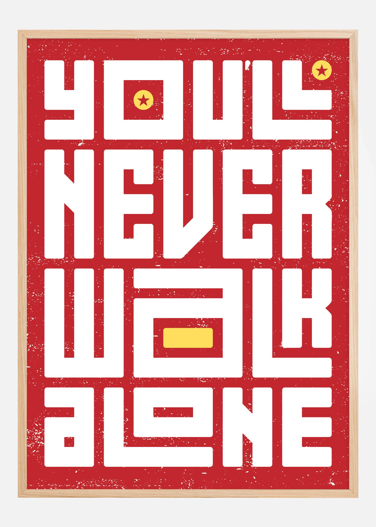 Šis energingas ir pakilus plakatas skleidžia stiprią aurą su savo drąsia, blokine tipografija, kuri pabrėžia pranešimą "You'll Never Walk Alone" ryškiai baltais rašmenimis ant galingo raudono fono. Didelės raidės yra kruopščiai išdėstytos, kad maksimalizuotų savo vizualinį efektą, ir yra papuoštos auksinės spalvos žvaigždutėmis bei stačiakampė forma, kuri nutraukia teksto bloką, suteikdama papildomą dimensiją dizainui.