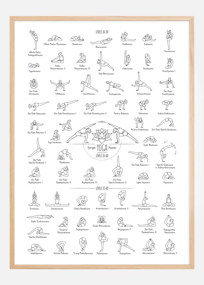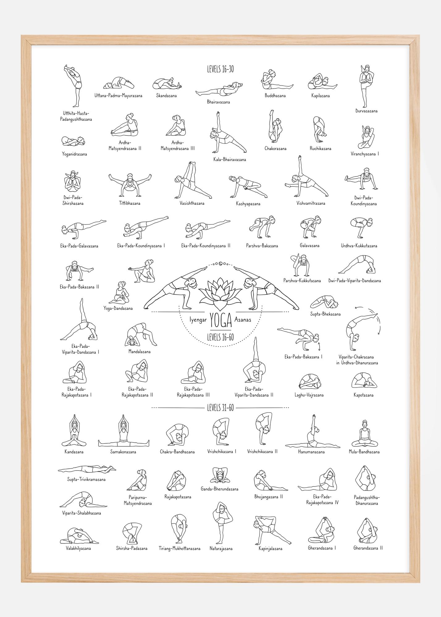 Plakato centre ir dėmesyje yra pavadinimas 'Iyengar JOGOS Asanos' ir sunkumo lygiai, kas nurodo, kad šie pratimai kilę iš specifinės jogos formos, sukurtos B.K.S. Iyengar. Ši mokomoji plakatinė yra puiki jogos entuziastui, norinčiam pagilinti savo praktiką, taip pat instruktoriams, kuriems reikia vizualinės nuorodos savo studijose. Jos švarus ir paprastas dizainas suteikia elegantišką ir funkcionalią dekoraciją, o tuo pačiu prideda įkvepiančią ir mokomąją atmosferą kambaryje.