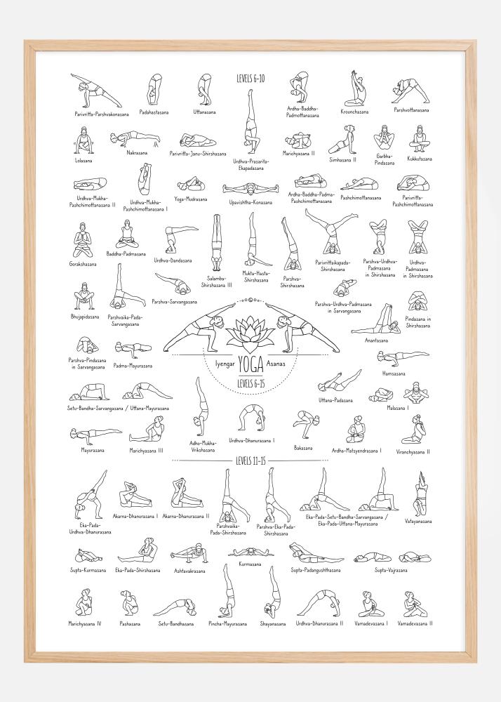 Šis išsamus ir pamokantis plakatas suteikia vizualinį Iyengar Jogos asanų vadovą 6-15 lygiams, pateiktą aiškioje ir metodiškoje struktūroje. Detalios iliustracijos pavaizduotos tiksliomis linijomis, kurios pabrėžia unikalias formas ir pozas kiekvienoje jogos poza. Virš kiekvieno paveikslo yra asanos pavadinimas sanskrito kalba, todėl praktikuotojams visais lygmenimis lengva atpažinti ir praktikuoti kiekvieną poziciją.
