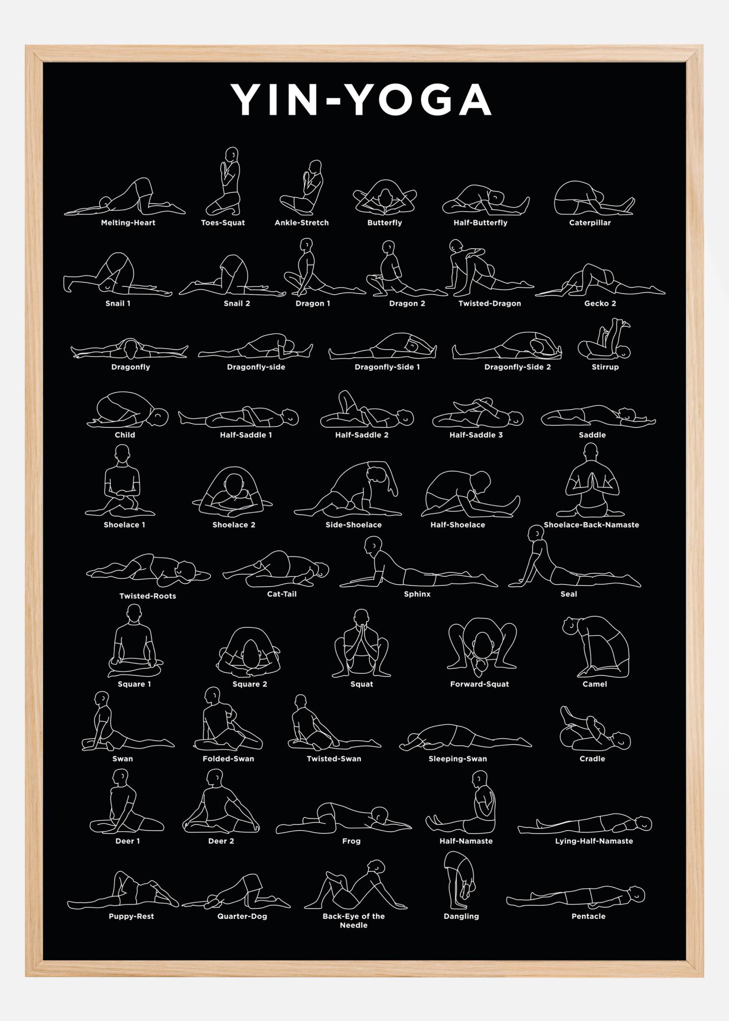 Naudingas plakatas su įvairiomis pozomis, kurias galite atlikti joga. Pažvelkite į šį juodą paveikslą, kuriame kiekviena yin jogos poza pavaizduota kaip paprasta balta figūra. Išmokite įvairias pozas lengvai, kai mažoji figūra parodo, kaip jas atlikti. Tapkite lankstūs šiais metais, kai pradėsite tempimo pratimus dėka šio spaudinio!