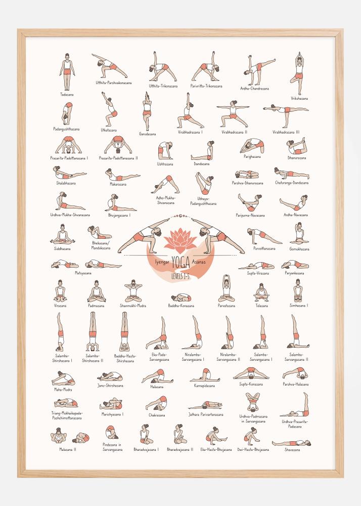 Šis spalvingas ir įkvepiantis plakatas iliustruoja platų Iyengar jogos Asanų spektrą 1-5 lygiams, pateiktą gyvu ir įtraukiančiu dizainu. Kiekviena asana aiškiai pavaizduota su detalia ir spalvinga iliustracija, kuri sustiprina jos formą ir suteikia neatidėliotiną vizualinį supratimą apie kiekvieną pozą. Pozų pavadinimai nurodyti greta kiekvienos iliustracijos sanskrito kalba, todėl plakatas tampa vertingu ir pedagoginiu šaltiniu.