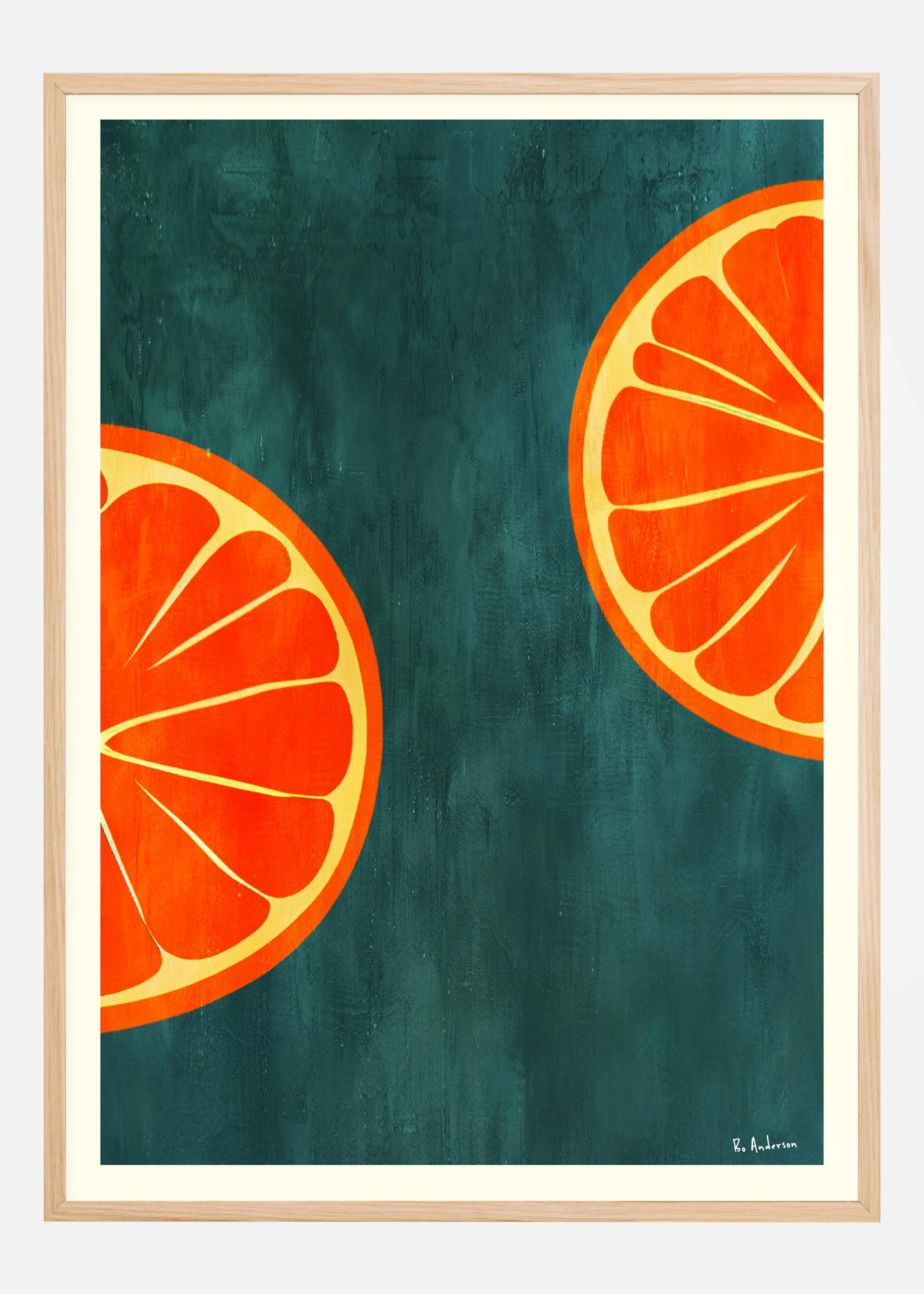 Ši šviesi ir gaivinanti plakatų iliustracija vaizduoja dvi perpjautas apelsinas tamsiai žalios spalvos fone, vaizdą, kuris yra toks pat energizuojantis kaip stiklinė šviežiai spaustų sulčių. Apelsinų griežinėlių sodrios, ryškios oranžinės spalvos atsiskleidžia prieš gilų foną, sukurdamos vaizdą, kuris yra paprastas ir įspūdingas. Tai yra dizainas, švenčiantis gamtos paprastumą ir grožį, kuris būtų tobulas, norint pabrėžti virtuvės ar valgomojo erdvę spalvų akcentu.
