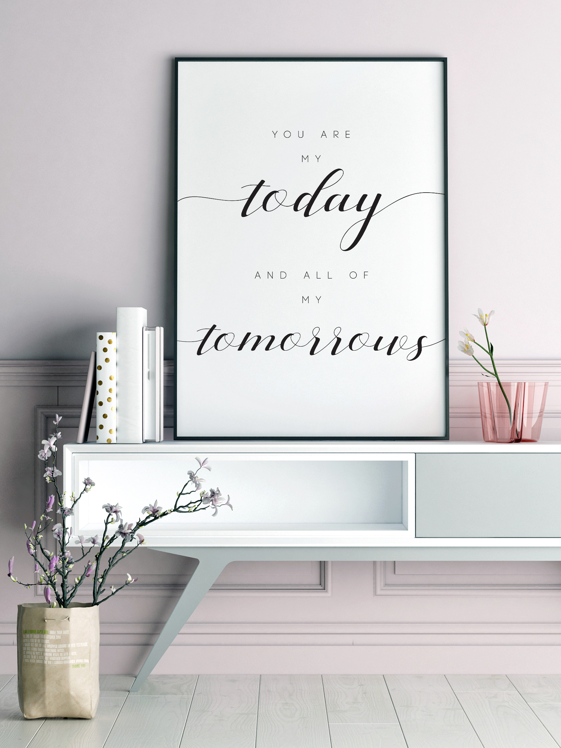 Motyvuojantis plakatas su stipria citata, kuri turėtų įkvėpti jus kasdien. Tu esi mano šiandiena ir visos mano rytojaus dienos yra puiki dovana mylimam asmeniui, kad parodytumėte, kiek juos vertinate. Padėkite jį vietoje, kur jie gali jį matyti kiekvieną rytą.