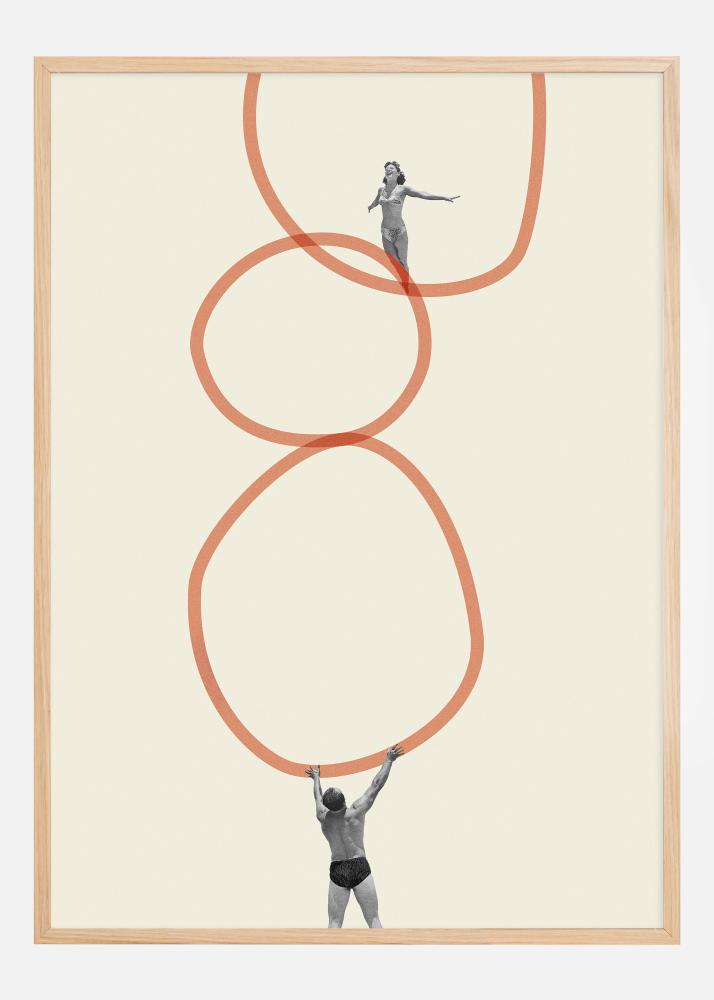 Šis unikalus plakatas pristato kompoziciją, primenančią kontūrų ir žmogiškosios sąveikos šokį. Vaizde matomas asmuo, atliekantis besirtinčią judesį, kuris balansuojamas kito tvirto ir stabilaus figūros ant žemės, abu įrėminti tekančių terakotos-raudonų apskritimų, kurie sukuria judesio ir tęstinumo pojūtį.