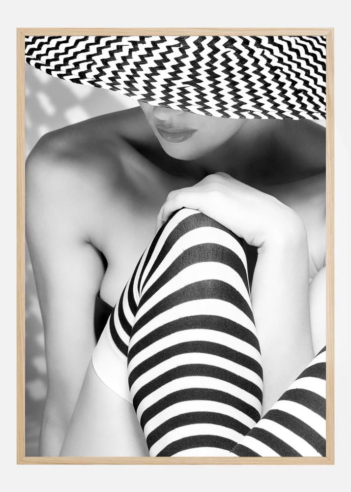 Geometriškas portretas plakatas moters, dėvinčios raštuotą skrybėlę ir dryžuotas kojines. Ji pasilenkusi į priekį su ranka ant kelio. Jos veidą uždengia skrybėlės raštas šioje įspūdingoje nuotraukoje. Derinkite tai su spalvų akcentais ant sienos ir stebėkite, kaip raštai sužavi.