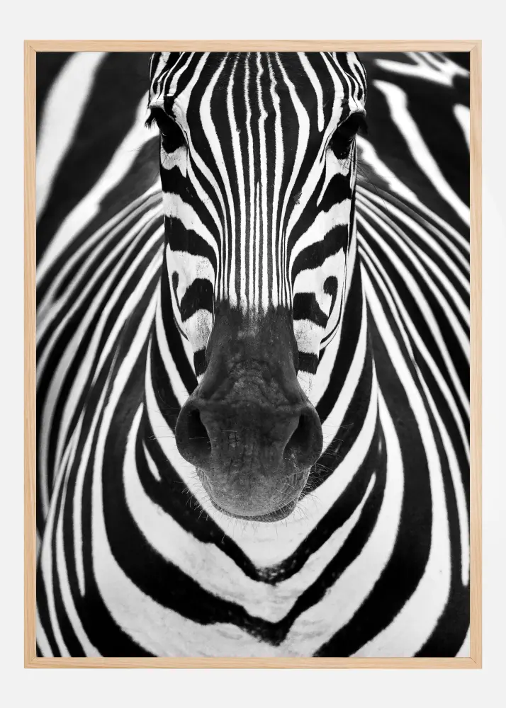 Nuostabus gyvūnų plakatas su zebra, atsisukusia į kamerą. Įneškite kelias stiprias formas į savo namus ir derinkite šį įspūdingą plakatą su šviesiai spalvota siena, kad sukurtumėte tikrą abstraktaus meno pojūtį.