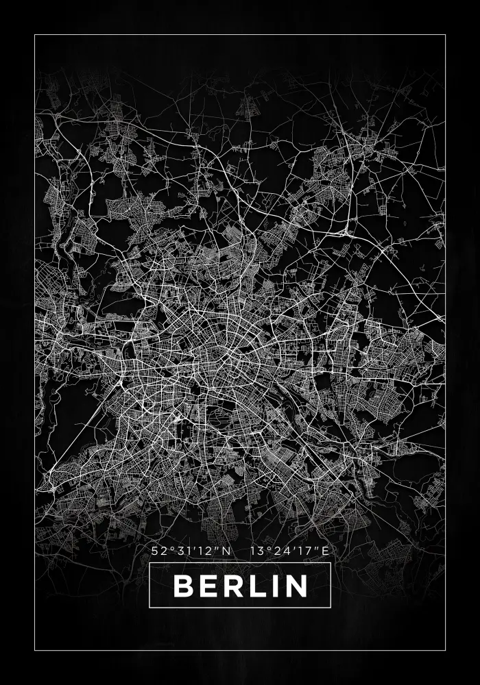 Jei ieškote pagarbos Berlynui, tai puikus pasirinkimas! Miesto gatvės ir aikštės baltos spalvos fone, juodame fone, tampa miesto žemėlapio puikaus vizualinio akcento centru. Apačioje yra miesto koordinatės, išspausdintos virš miesto pavadinimo, kuris užrašytas didelėmis raidėmis. Berlinas, tiek pavadinimas, tiek žemėlapis, elegantiškai įrėmintas plonu baltu rėmeliu. Miesto žemėlapis apsuptas plačia juoda riba, kuri sukuria gražią oro erdvę tarp rėmelio ir plakato turinio. Galingas ir kartu stilingas žemėlapio plakatas, kuris yra puiki interjero detalė!